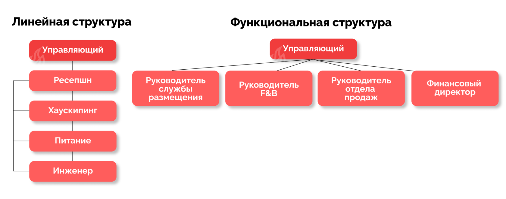 Самая простая схема: один руководитель, дальше цепочка подчинения вниз. Ресепшн, хаускипинг, питание, инженерка — у каждого старший, все сходится к управляющему.