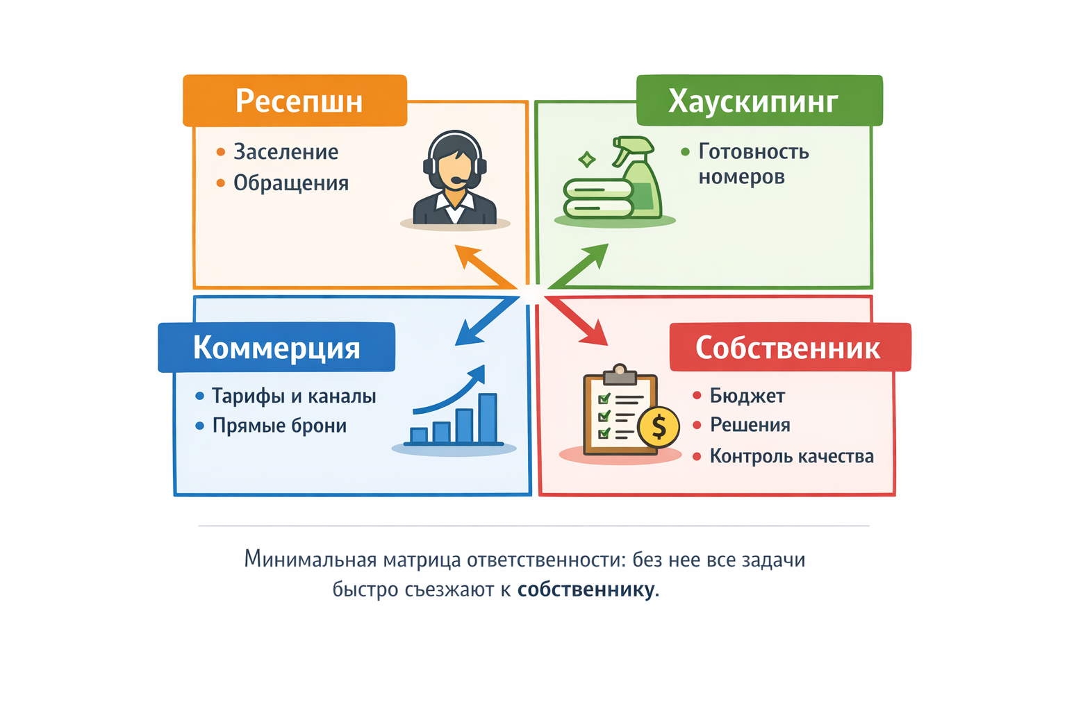 Команда и смены. Важнее не мотивационные речи, а расписание, стандарты и контроль. Ресепшн одинаково отрабатывает заселение и конфликты, хаускипинг держит качество уборки, техслужба закрывает заявки. Иначе гости увидят проблему раньше вас.