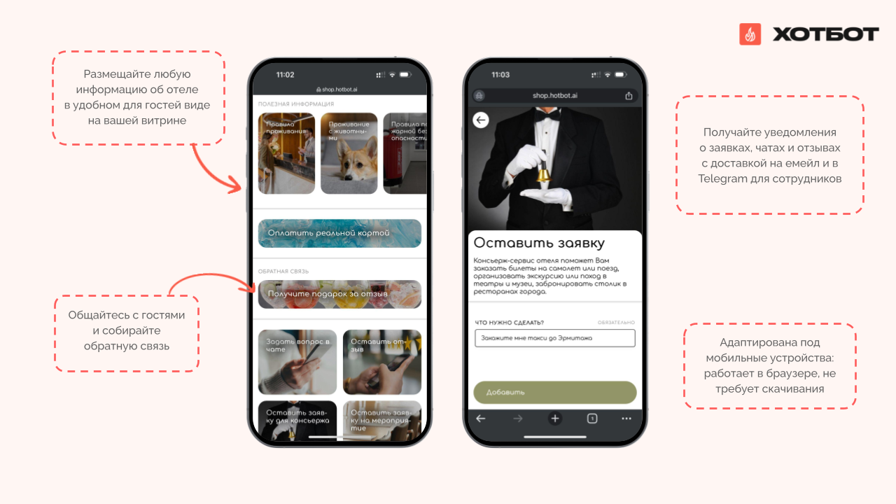 Онлайн‑витрина доп.услуг Хотбот — инструмент, который упрощает сбор аналитики и повышает продажи. Здесь можно добавить любую информацию об отеле, собирать заявки и принимать оплату онлайн. Через витрину: