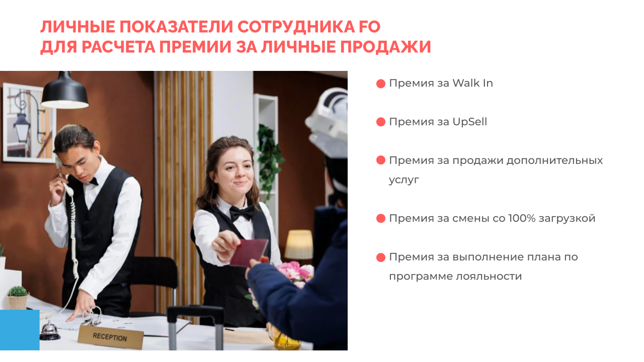 - Выполнение плана по программе лояльности. Премию выдают за то, что сотрудник привлекает гостей в программу лояльности отеля.