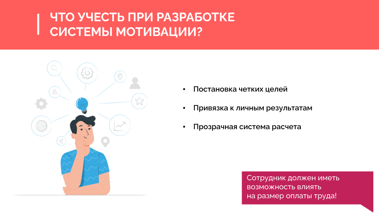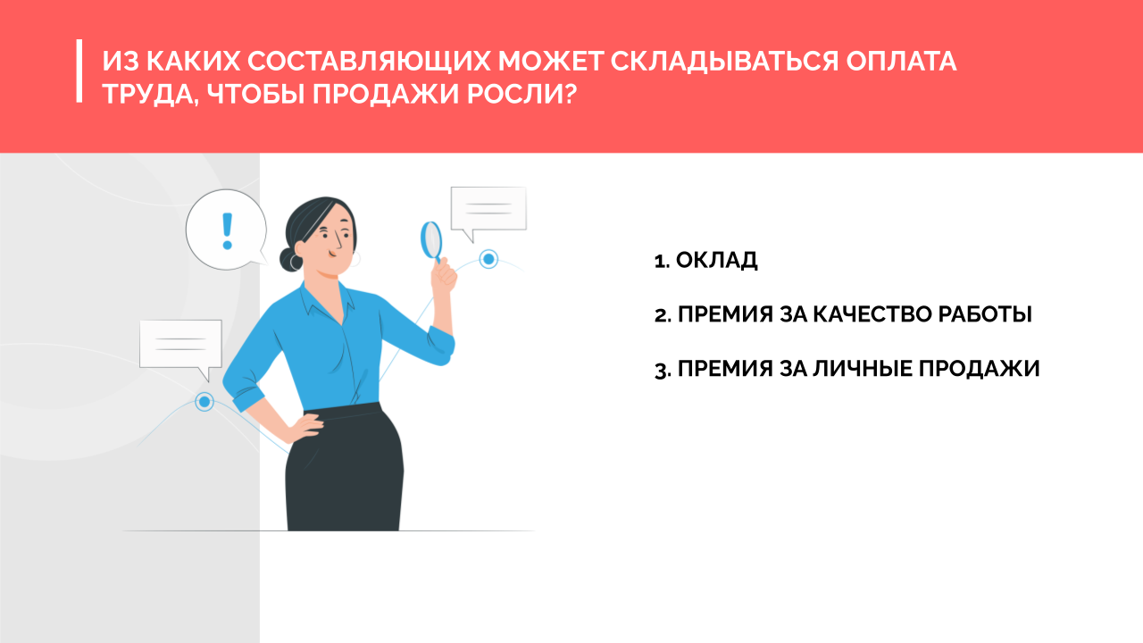 - Настройте материальную мотивацию. Разделите зарплату на оклад, премию за качество по KPI и премию за личные продажи. Установите понятные критерии расчета и ощутимый размер вознаграждения.