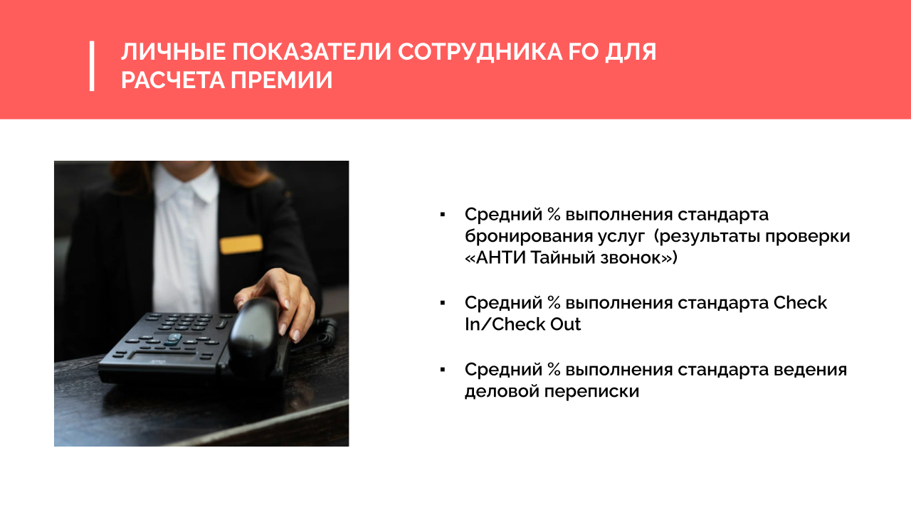 2. Премия за качество зависит от выполнения стандартов работы (KPI). Например, от того, насколько хорошо сотрудник: соблюдает правила бронирования по телефону, ведет деловую переписку, следит за внешним видом, правильно работает с персональными данными гостей и выполняет стандарт чек-ина.