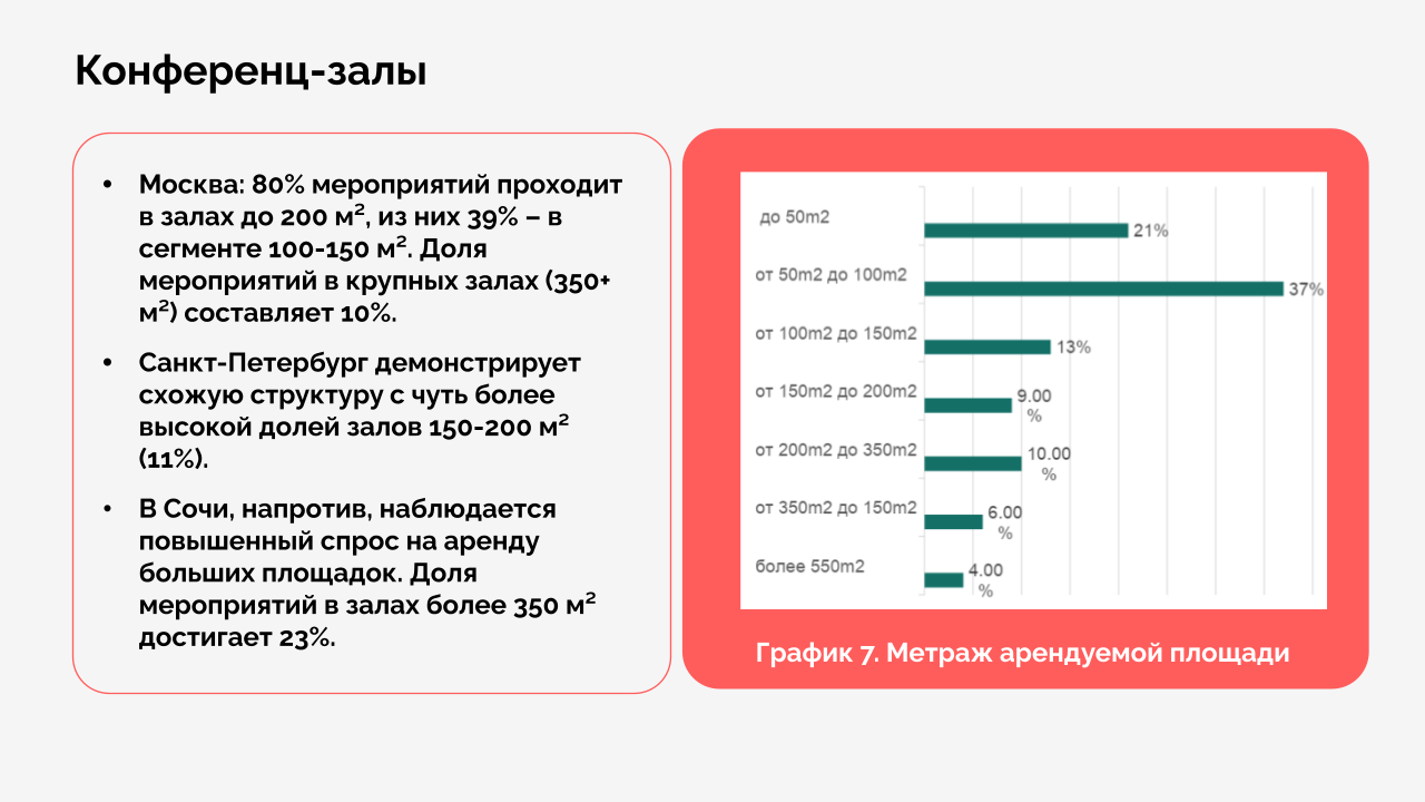 Ситуация с конференц‑залами неоднородная — в Москве, Петербурге и Сочи показатели сильно различаются. В Москве 80% мероприятий проходят в залах площадью до 200 кв. м. При этом крупные события сохраняются. Например, в Сочи 23% мероприятий проводятся в залах более 350 кв. м.