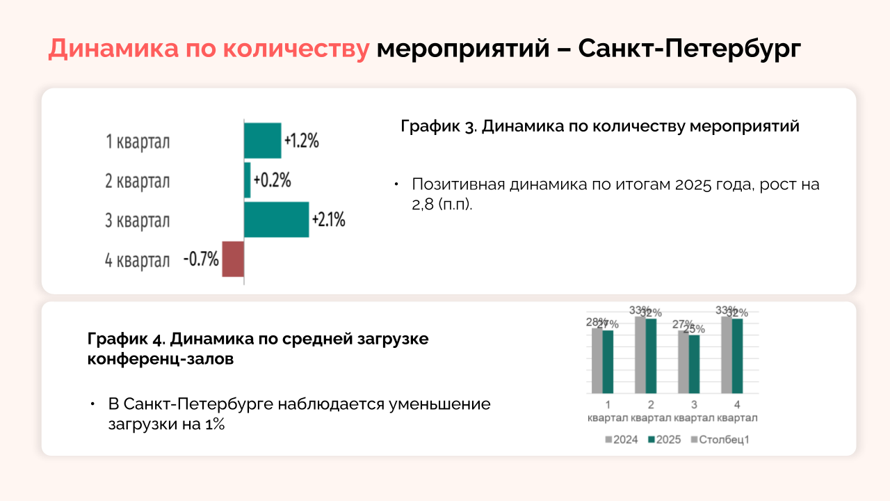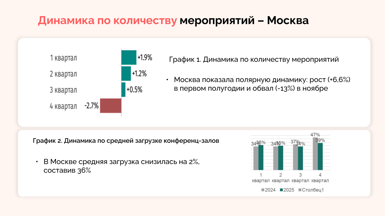 В 2025 году в столице рынок мероприятий продемонстрировал неоднозначную динамику. Хотя общее количество событий выросло на 0,9%, этот показатель существенно ниже прогнозного 4,6%. Ситуация заметно ухудшилась с августа 2025 года, когда произошло резкое сокращение числа мероприятий главным образом за счет спада частных событий, свадеб и банкетов. В 2024 году они проводились достаточно активно.