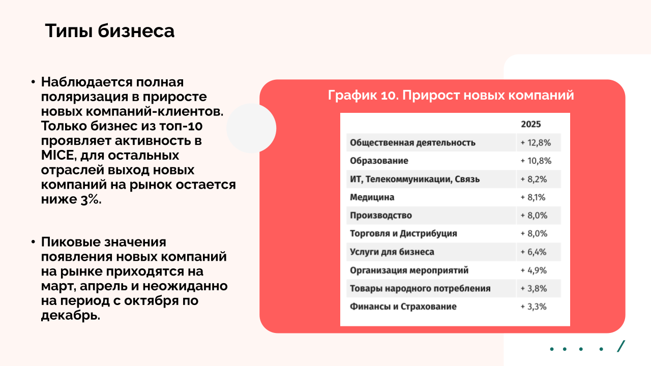 Рынок поляризуется: из 20 отслеживаемых типов бизнеса 10 показали рост, а еще 10 — спад. Это касается и количества мероприятий, и проданной площади. Клиентская база расширяется — это повод активнее работать с B2B‑сегментом.