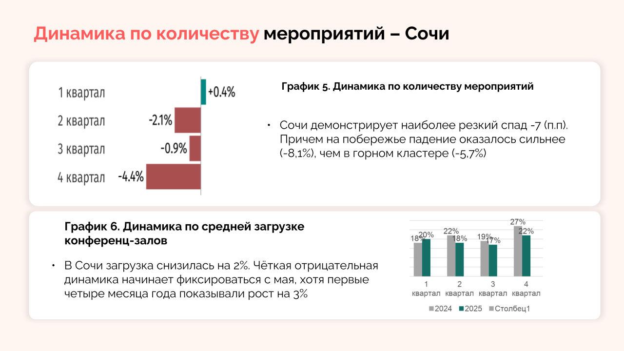 В Сочи выявили снижение общего числа мероприятий на 7%: в горном кластере показатель упал на 5,7%, а на побережье — на 8,1%. Основными причинами такой динамики стали отток клиентов в Турцию и сложности с авиасообщением.