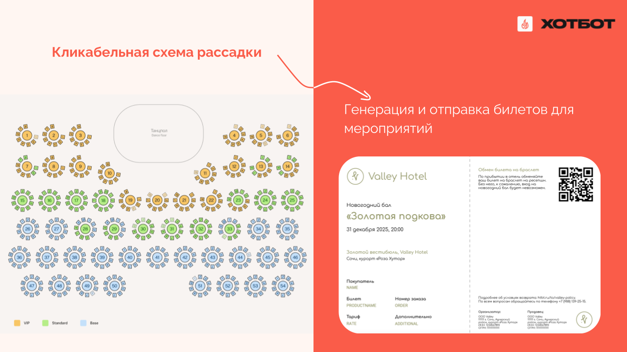 Еще Хотбот разработал систему, которая помогает продавать билеты на мероприятия отеля — от новогодних банкетов до конференций. Гость может выбрать место и меню, а отель заранее спланировать закупки и избежать лишних трат. В итоге гость получает красивый электронный билет, как в профессиональных билетных системах.