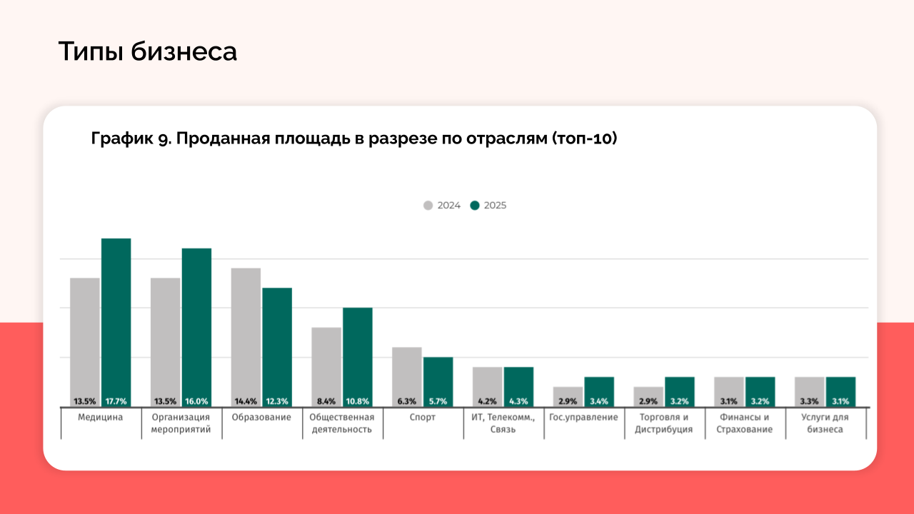 - Фокусируйтесь на растущих сегментах. Уделяйте внимание таким сегментам, как медицина, торговля и дистрибуция. Обратите внимание на госуправление — оно впервые вошло в топ‑10 по проданной площади.