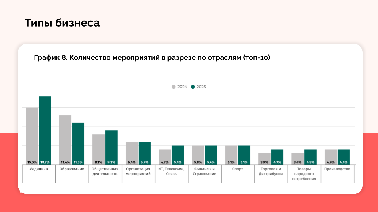 Рынок демонстрирует явную поляризацию: половина из 20 отслеживаемых бизнес‑направлений показала рост, другая половина — снижение. Из топ‑10 по числу мероприятий выбыли B2B‑компании, а также маркетинговые и бухгалтерские службы. Раньше они регулярно проводили события, чтобы продемонстрировать свои услуги. Тем не менее эти игроки сохраняют присутствие в рейтинге по проданной площади: хотя количество их мероприятий сократилось, каждое событие стало масштабнее.