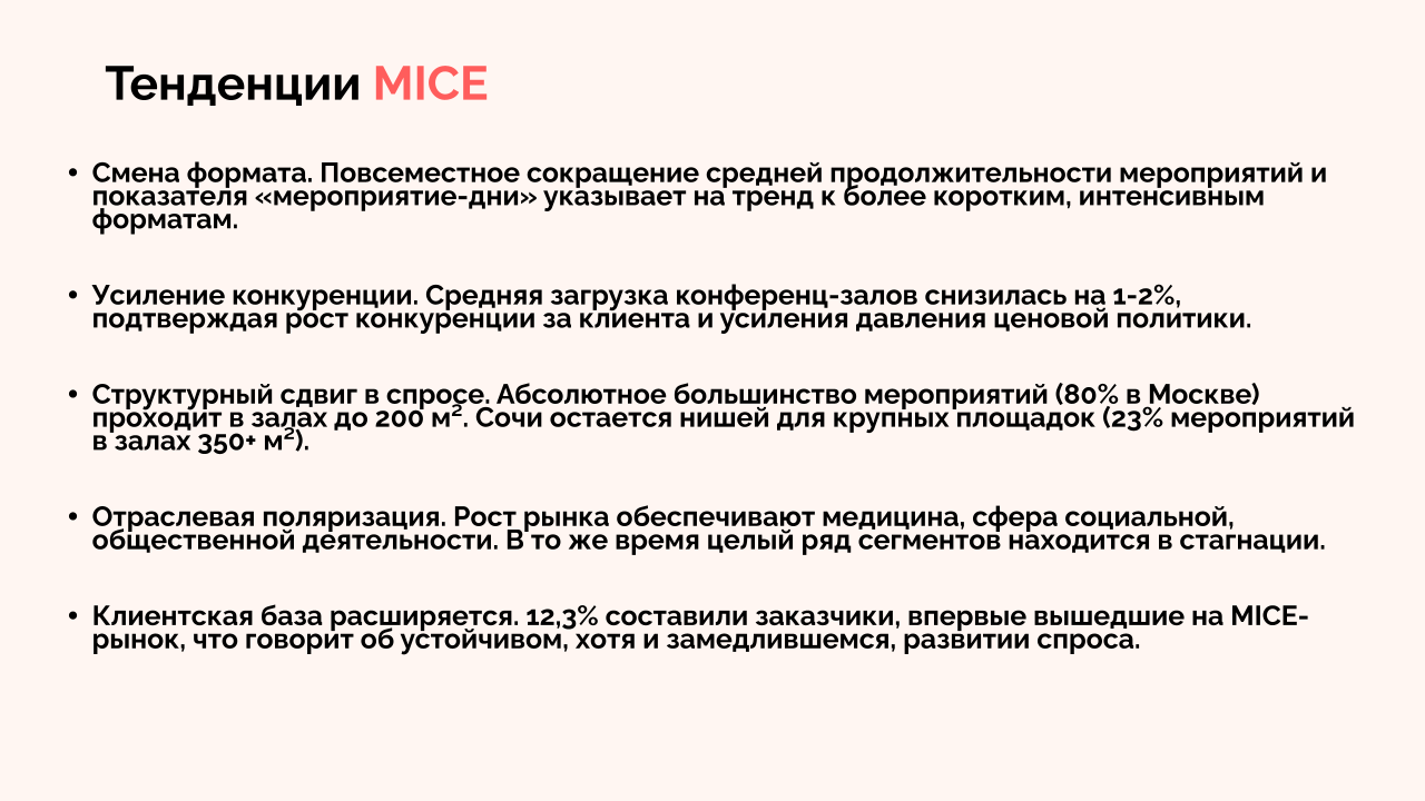 Важно: рынок остается поляризованным. Главный тренд — увеличивается масштаб мероприятий при снижении их общего числа у отдельных игроков. Отели могут выигрывать, если будут фокусироваться на растущих нишах вроде медицины, торговли и госсектора и адаптироваться к сезонным колебаниям спроса.