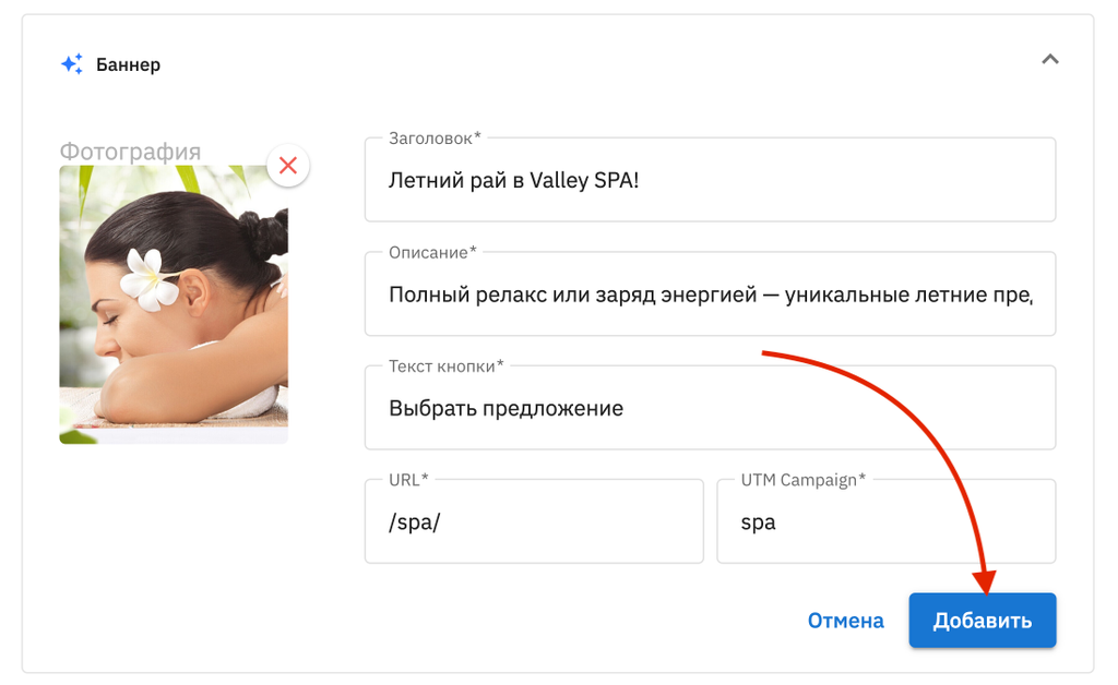 9. Сохраните настройки баннера по кнопке Добавить