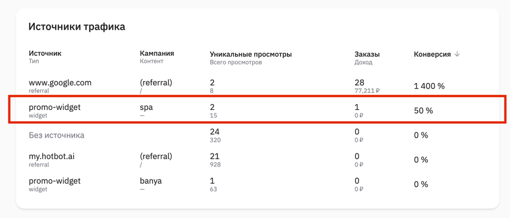 Найдите строку с источником трафика promo-widget. В этой строке можно отслеживать Уникальные преходы на витрину из баннера, Заказы и Конверсии.