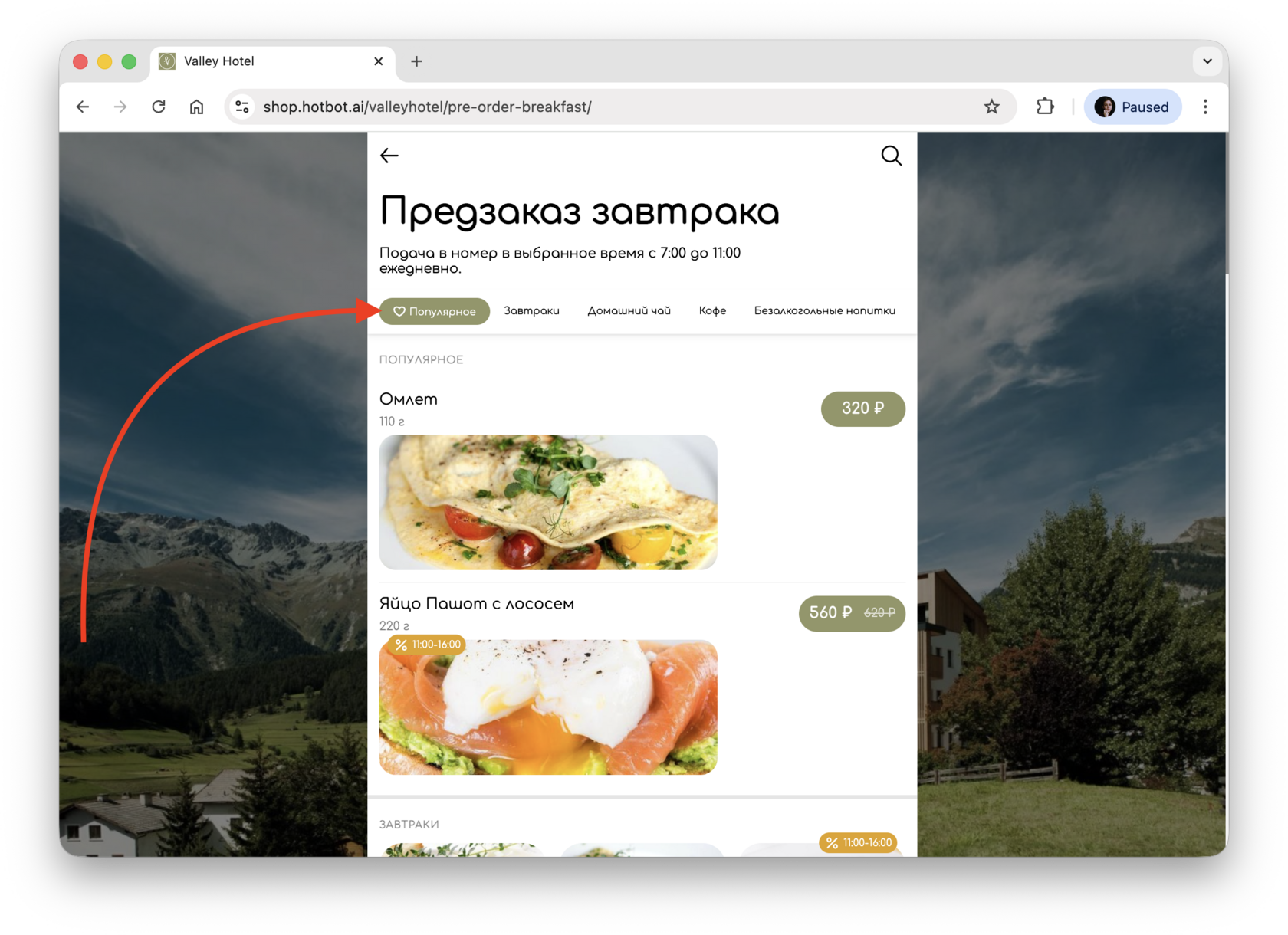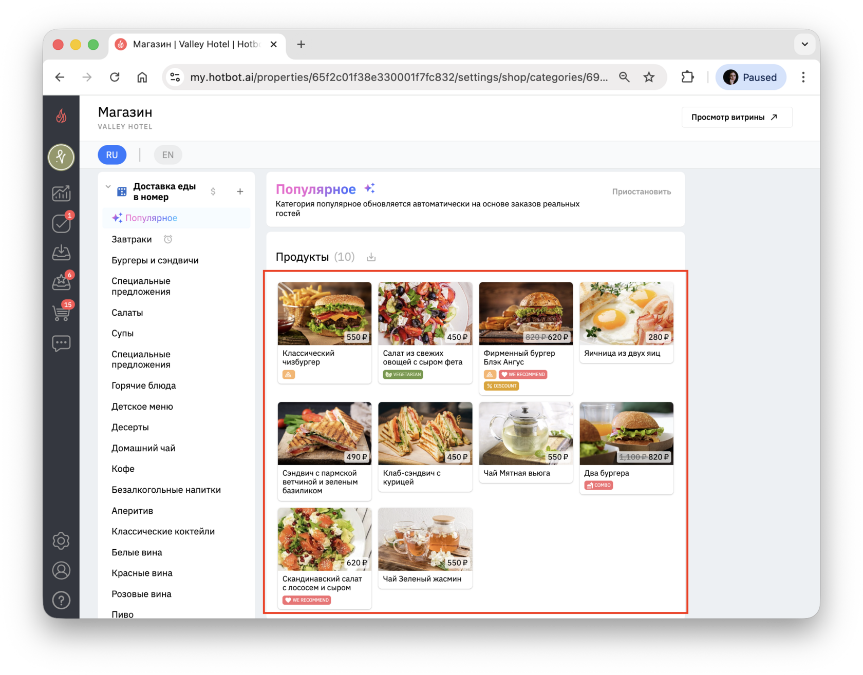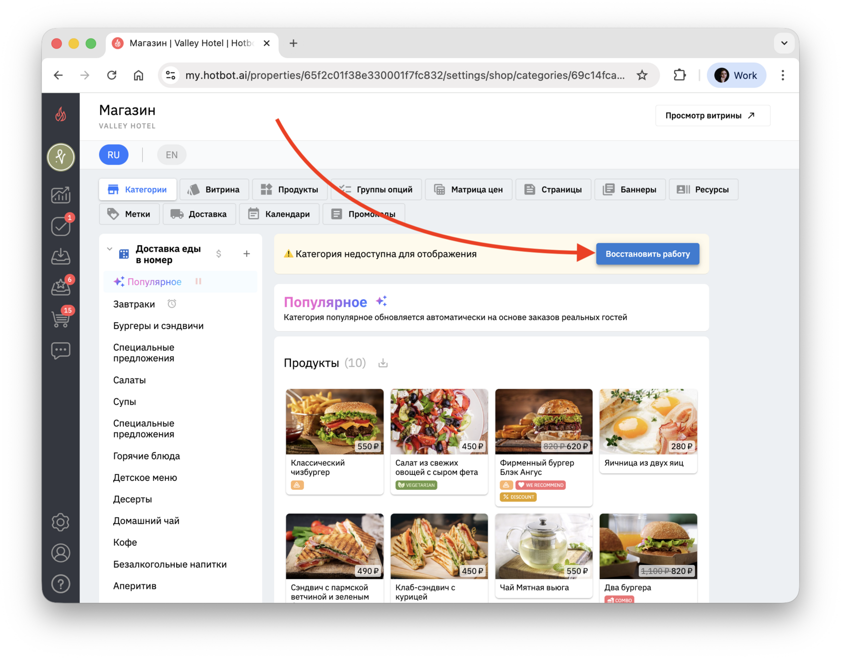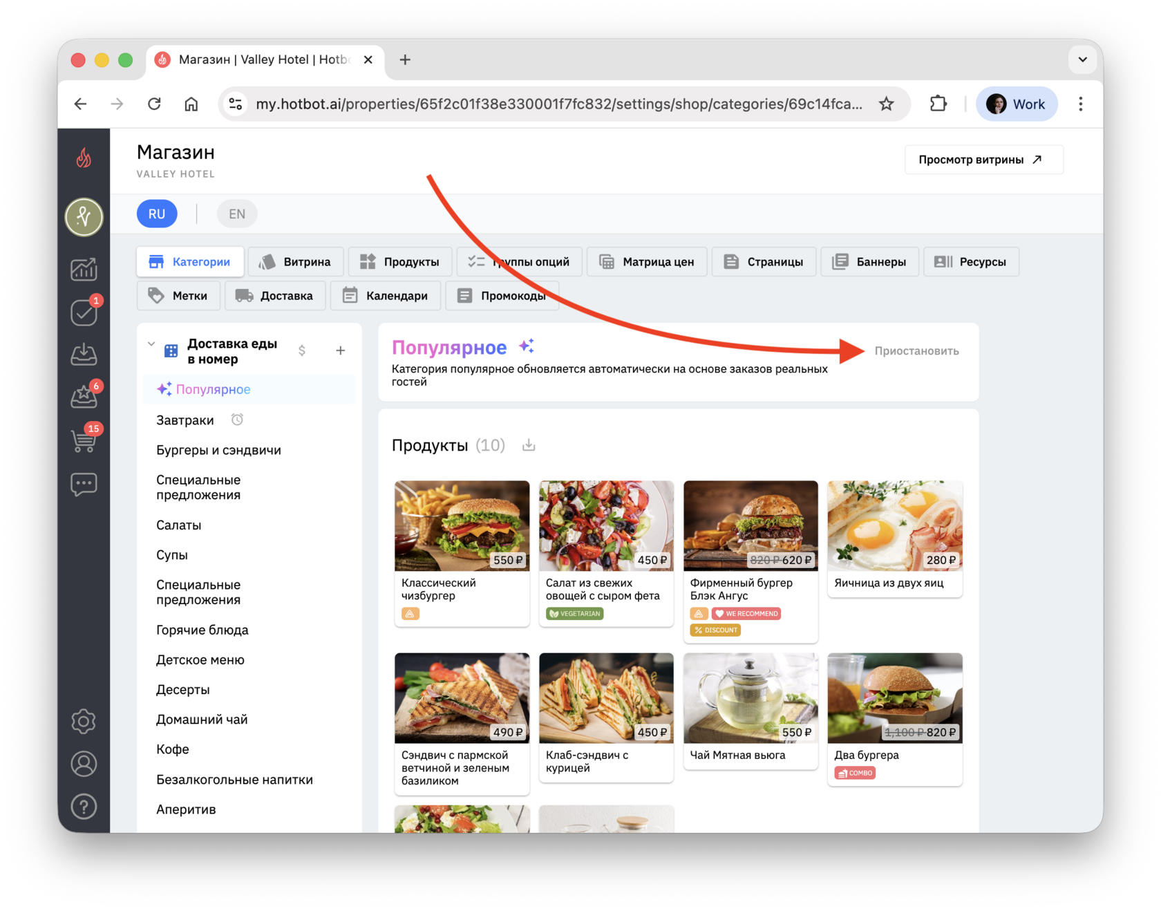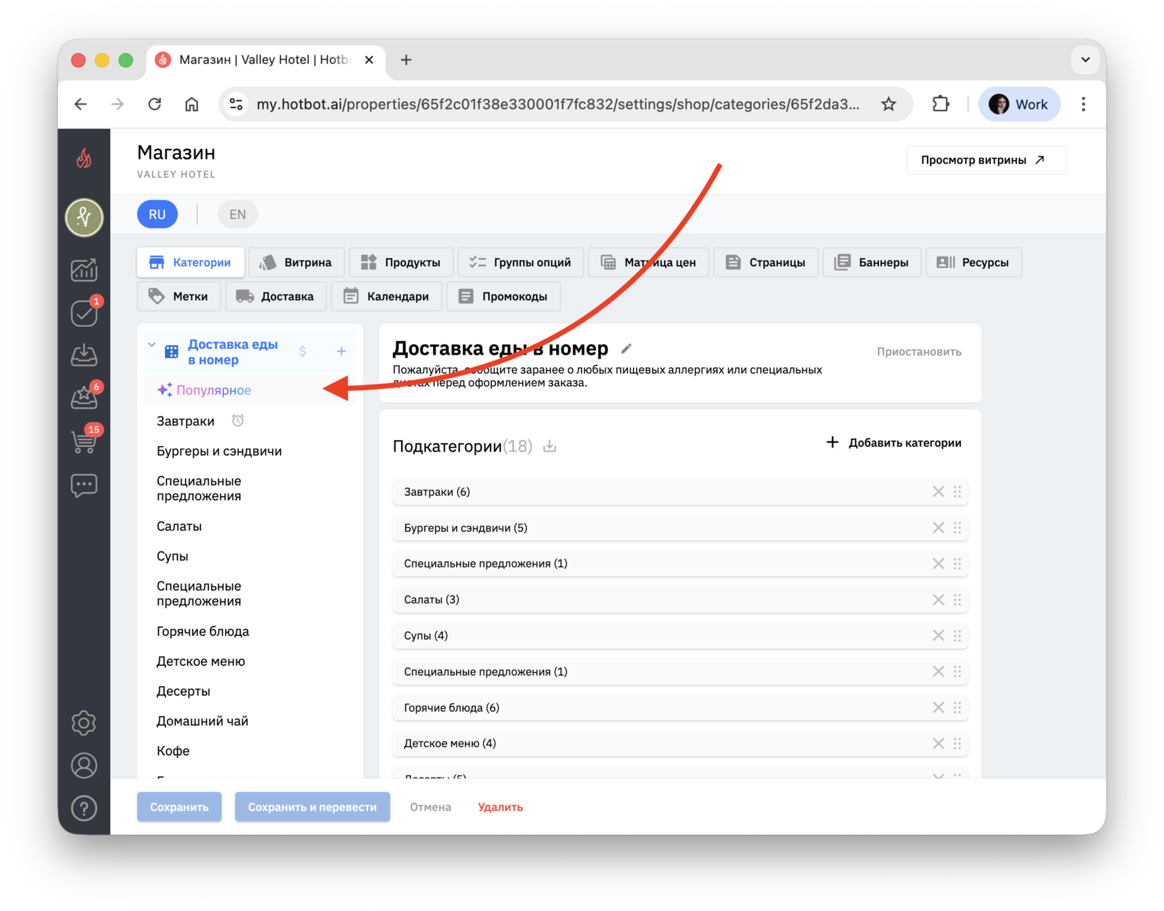 В категориях с типом «Еда в номер» находится подкатегория «Популярное».