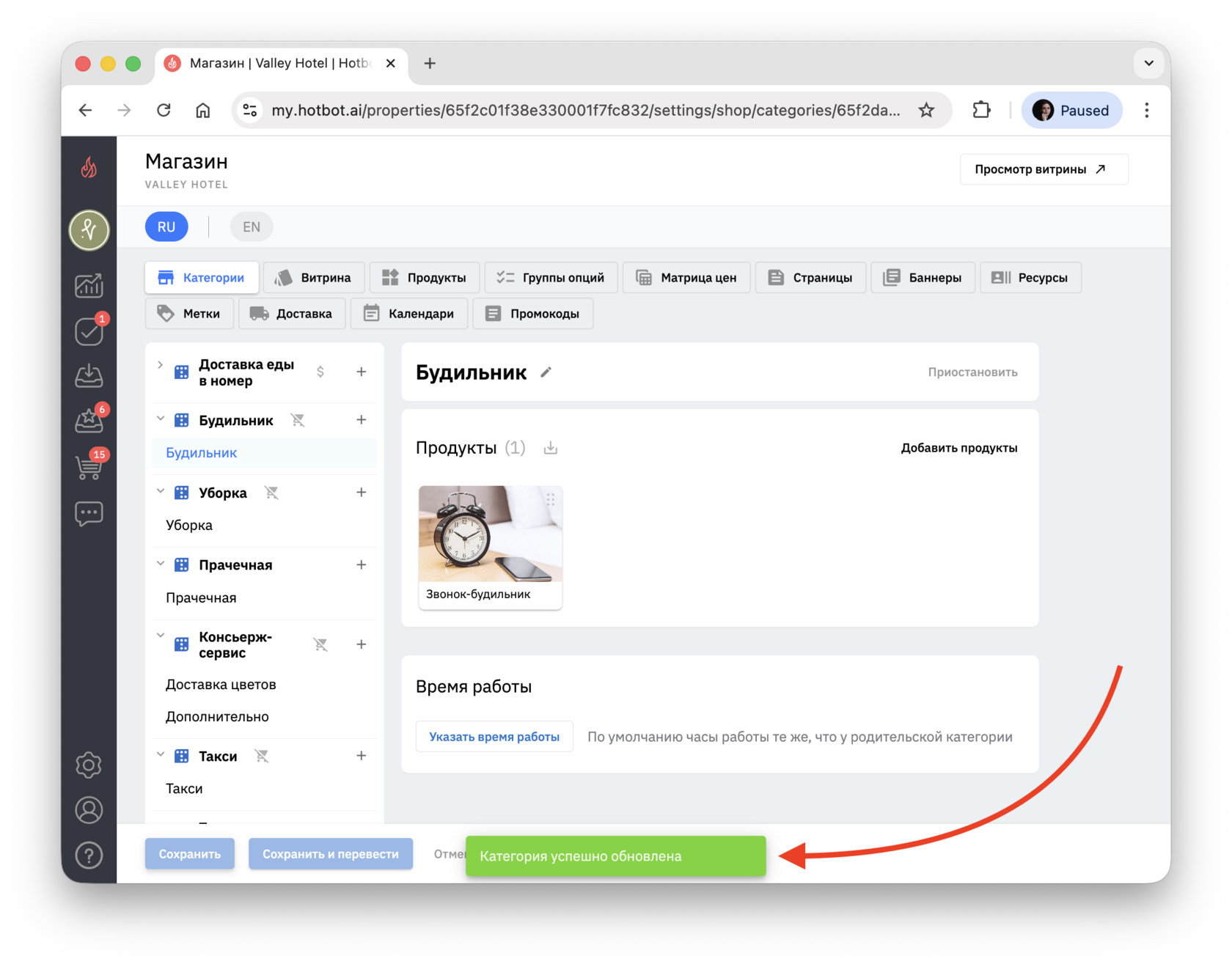 - Категории магазина помогают организовать товары и услуги отеля в удобные разделы, такие как доставка еды, спа-услуги и др.