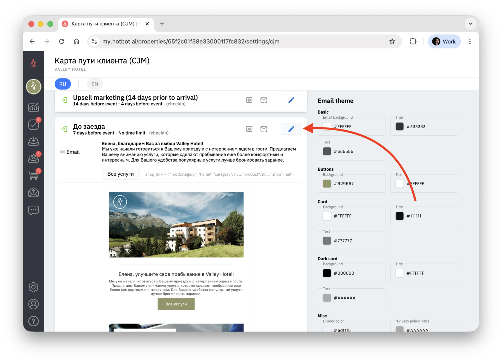 На открывшейся странице вы увидите список настроенных для вашего отеля писем CJM.