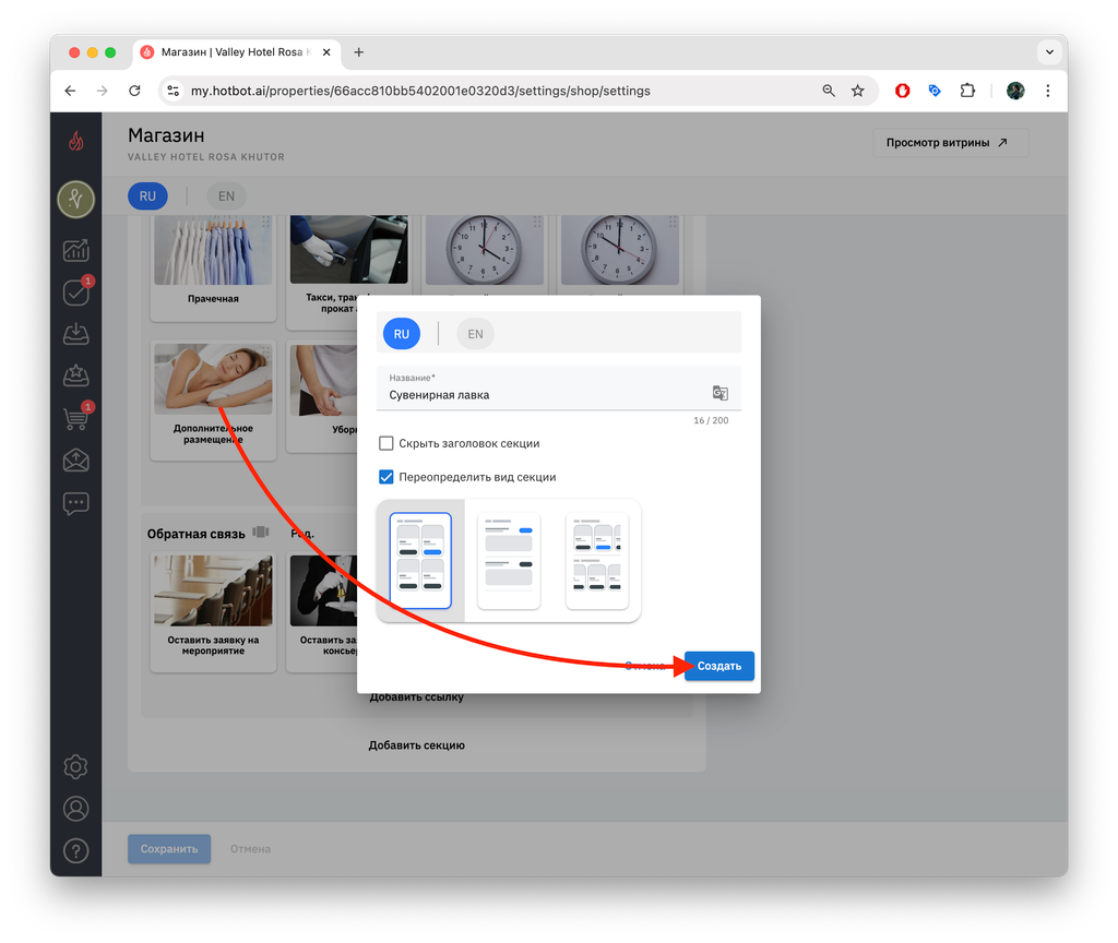 3. В открывшемся окне укажите название секции, выберите необходимые настройки и нажмите Создать. Новая секция появится в самом низу страницы.