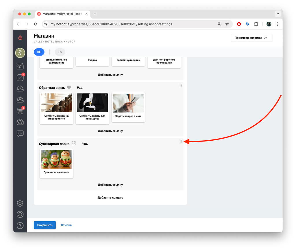 7. Переместите секцию в нужное место на витрине с помощью кнопки с точками.