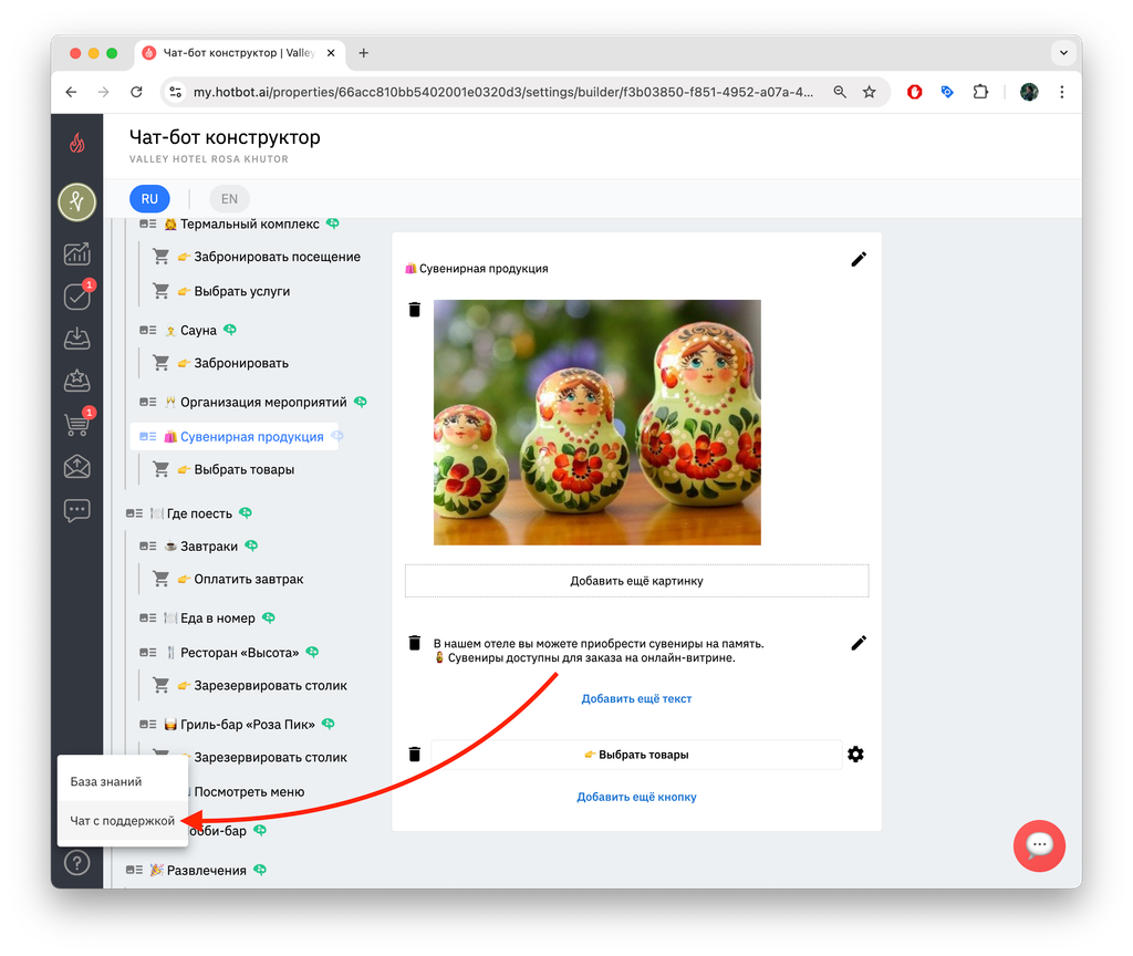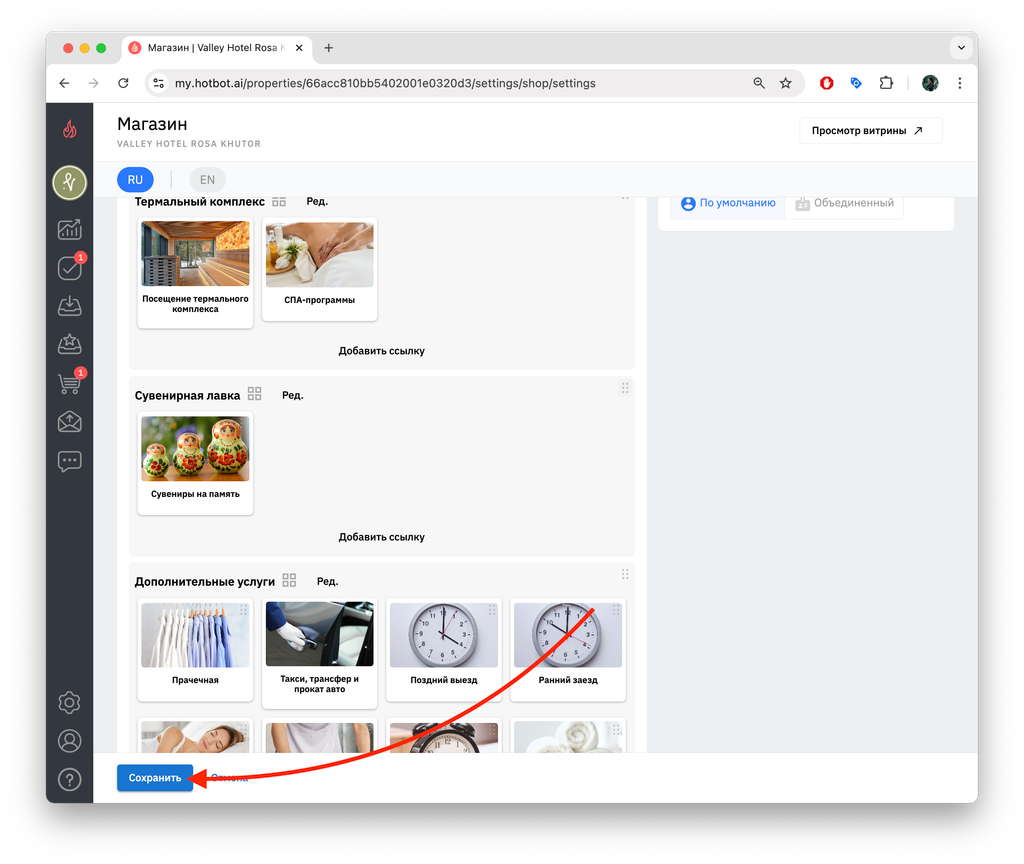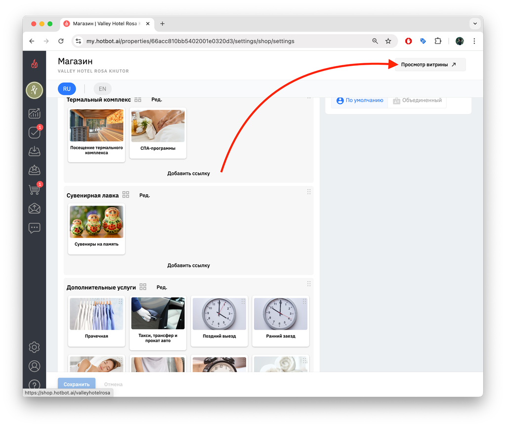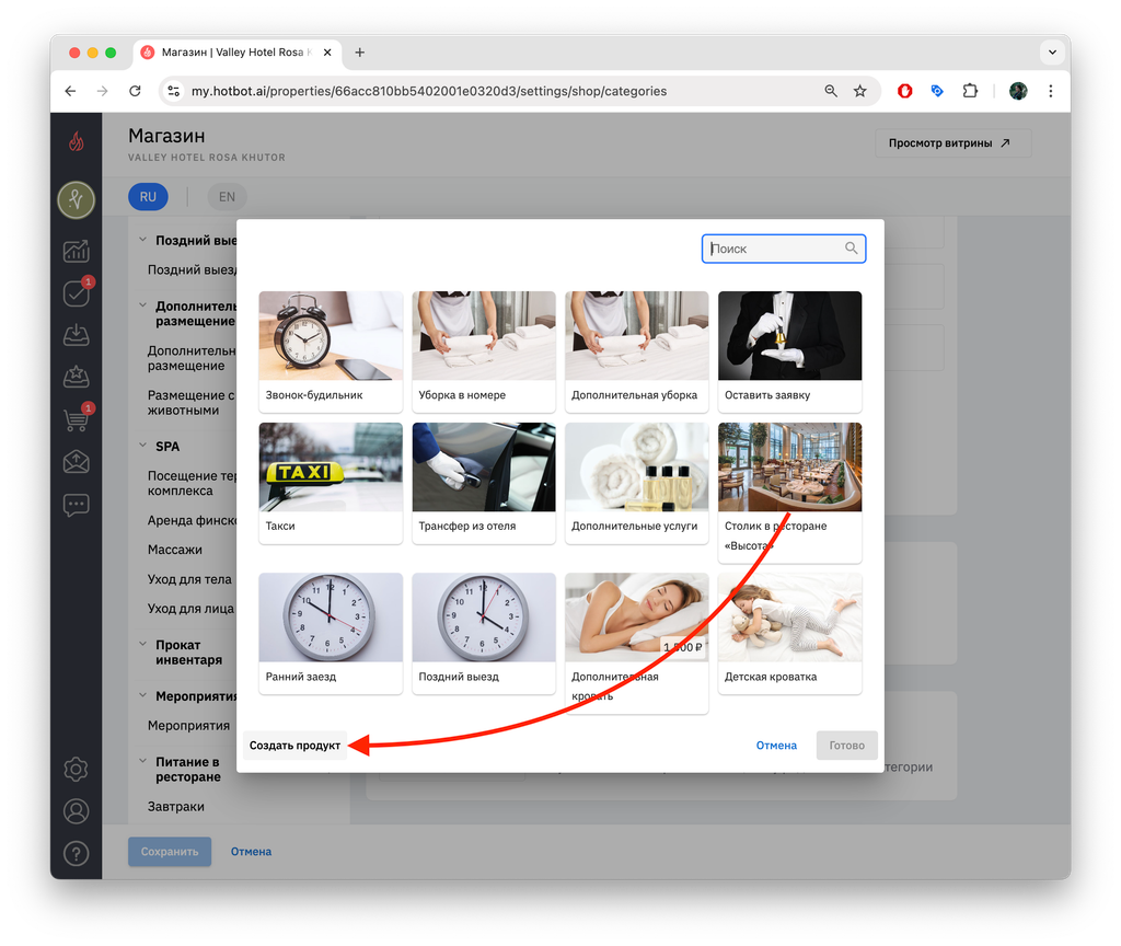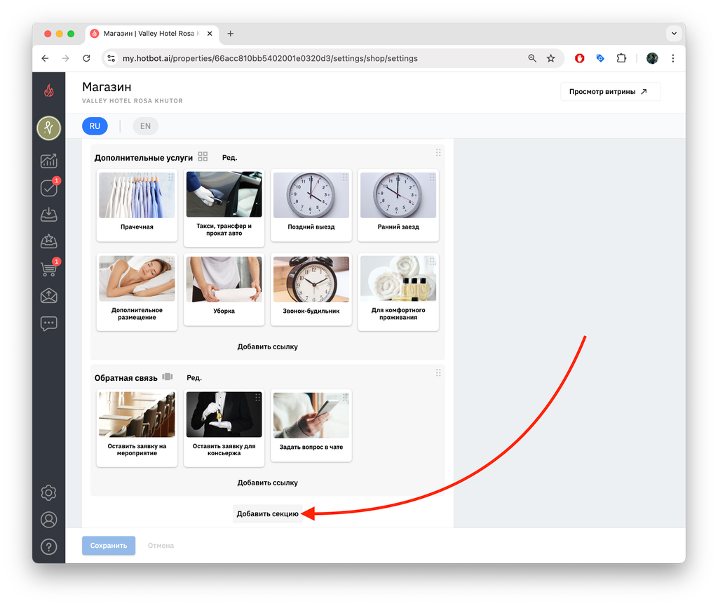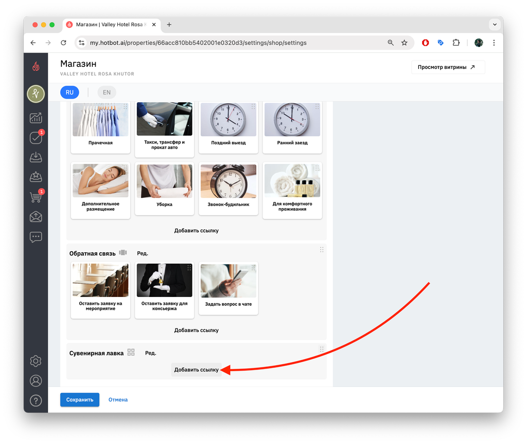 Управление контентом магазина и отправьте запрос в службу поддержки по кнопке ❓ в нижнем левом углу личного кабинета или на support@hotbot.ai.