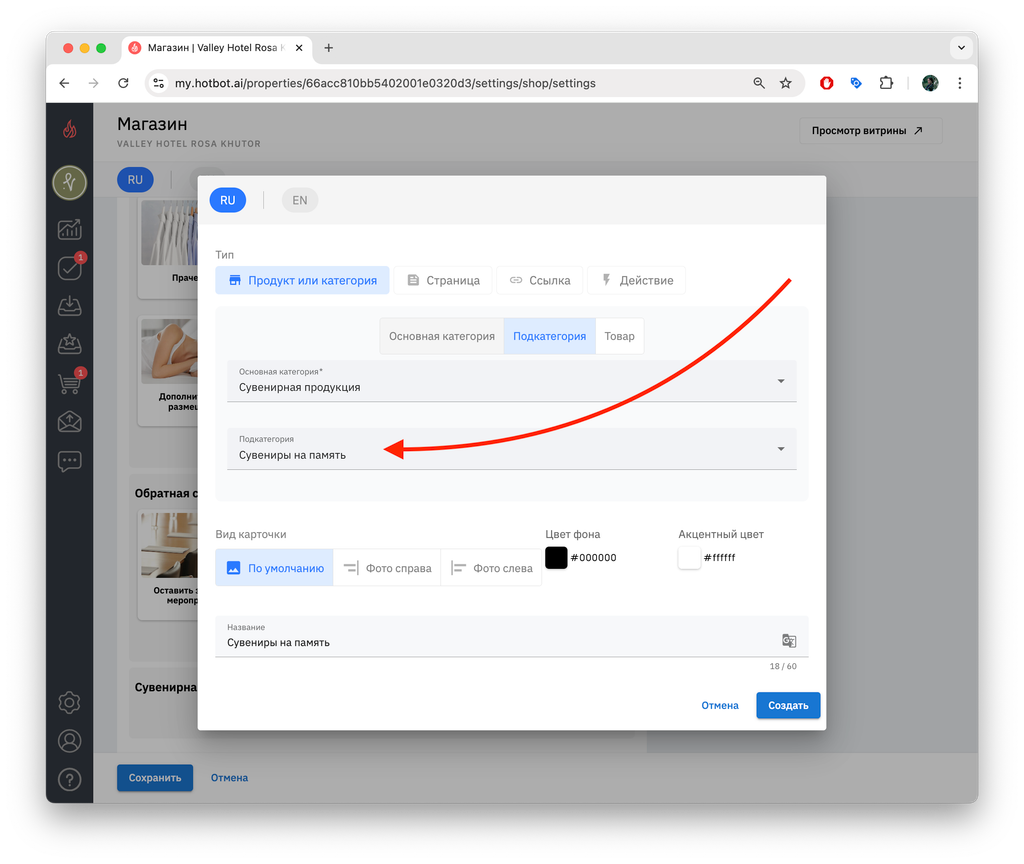 • Подкатегория — если вам нужно вести карточку на подкатегорию, сначала нужно выбрать основную категорию, а затем подкатегорию в выпадающем списке ниже.