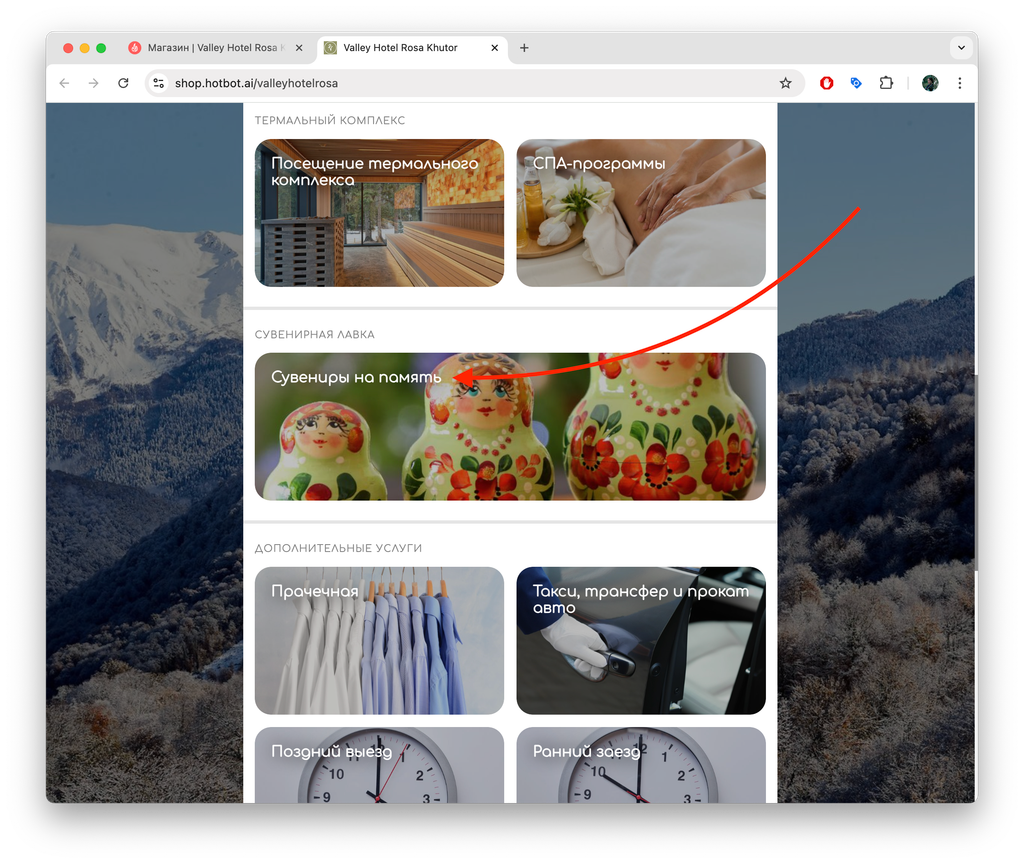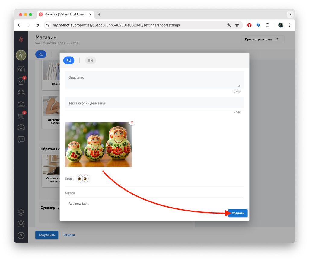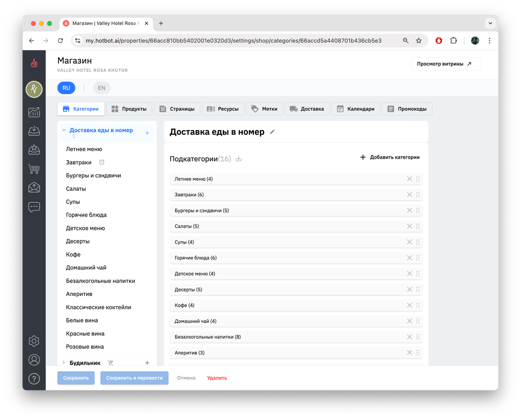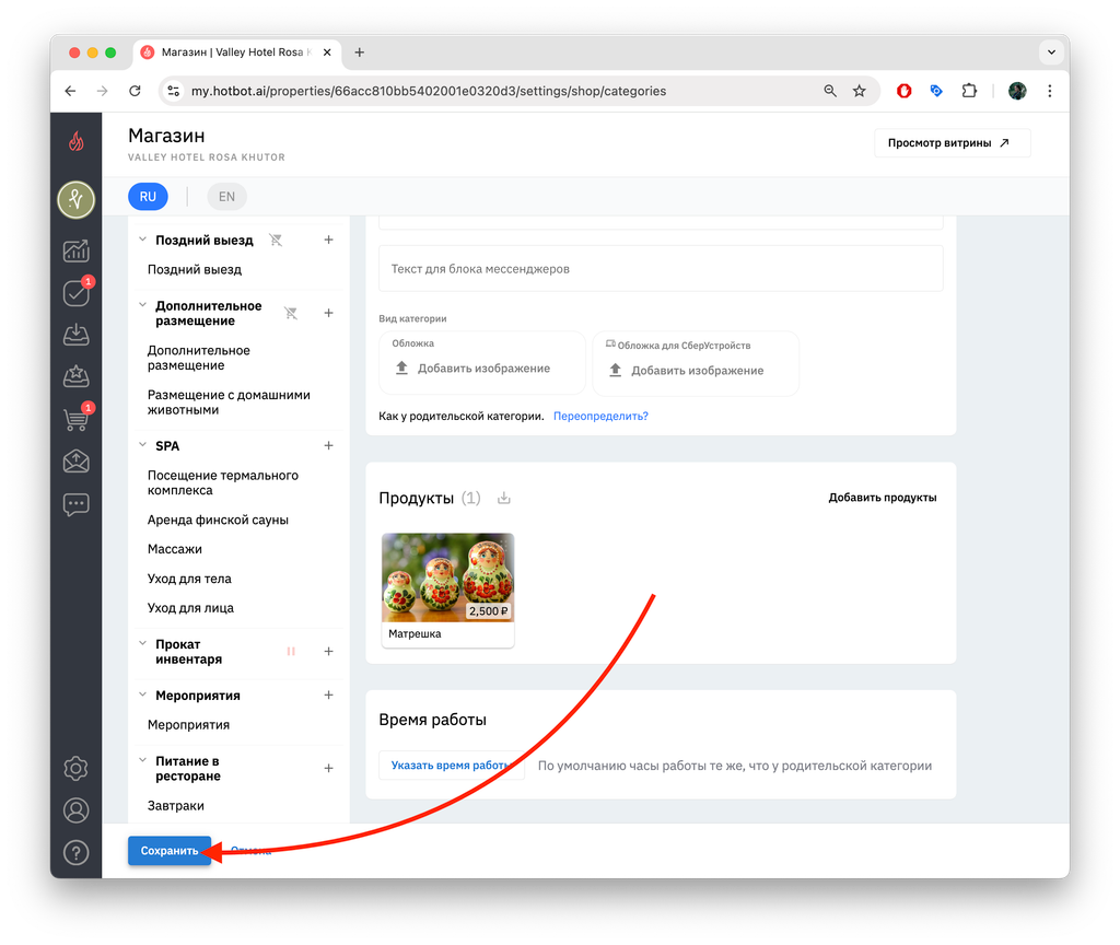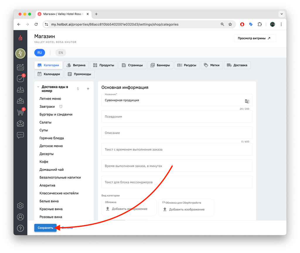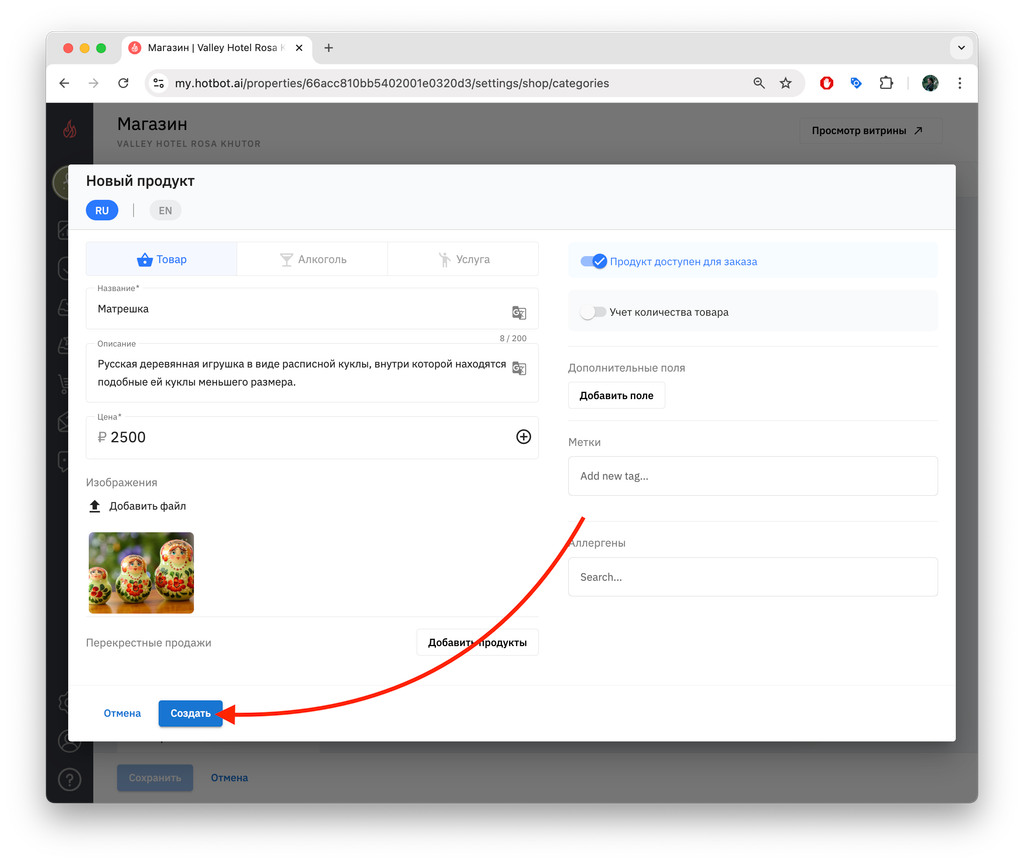 После внесения всех данных товары появятся на витрине и будут доступны гостям.
