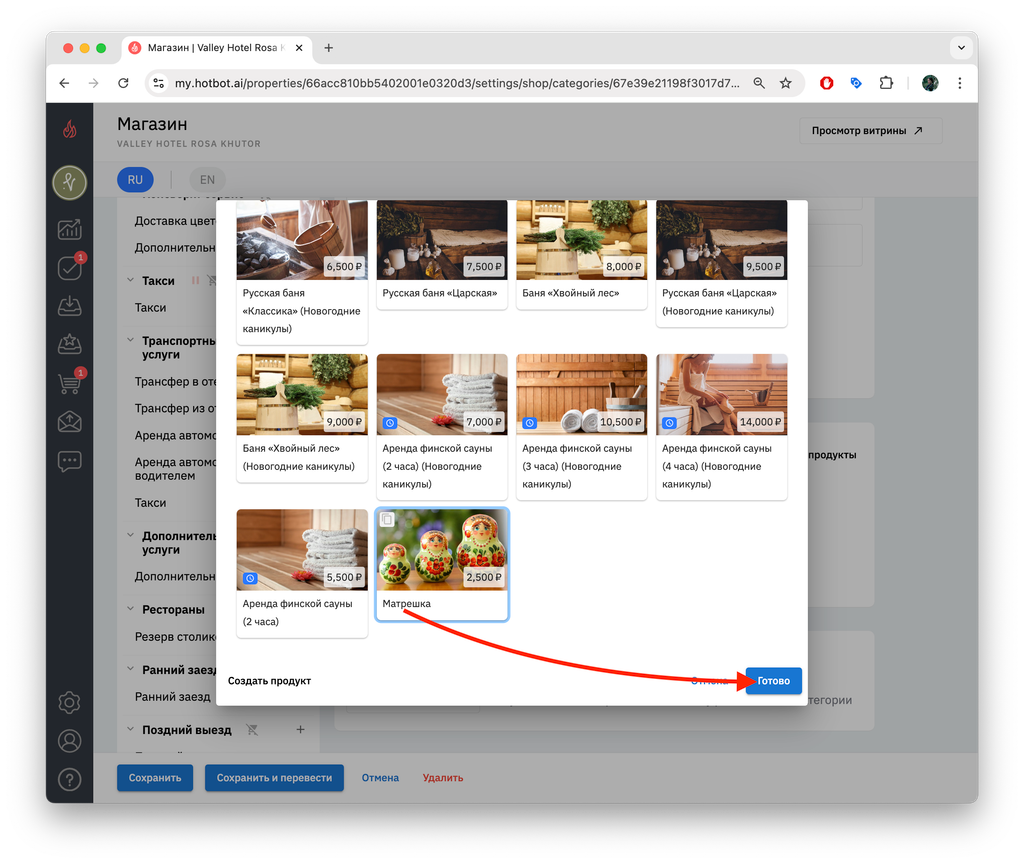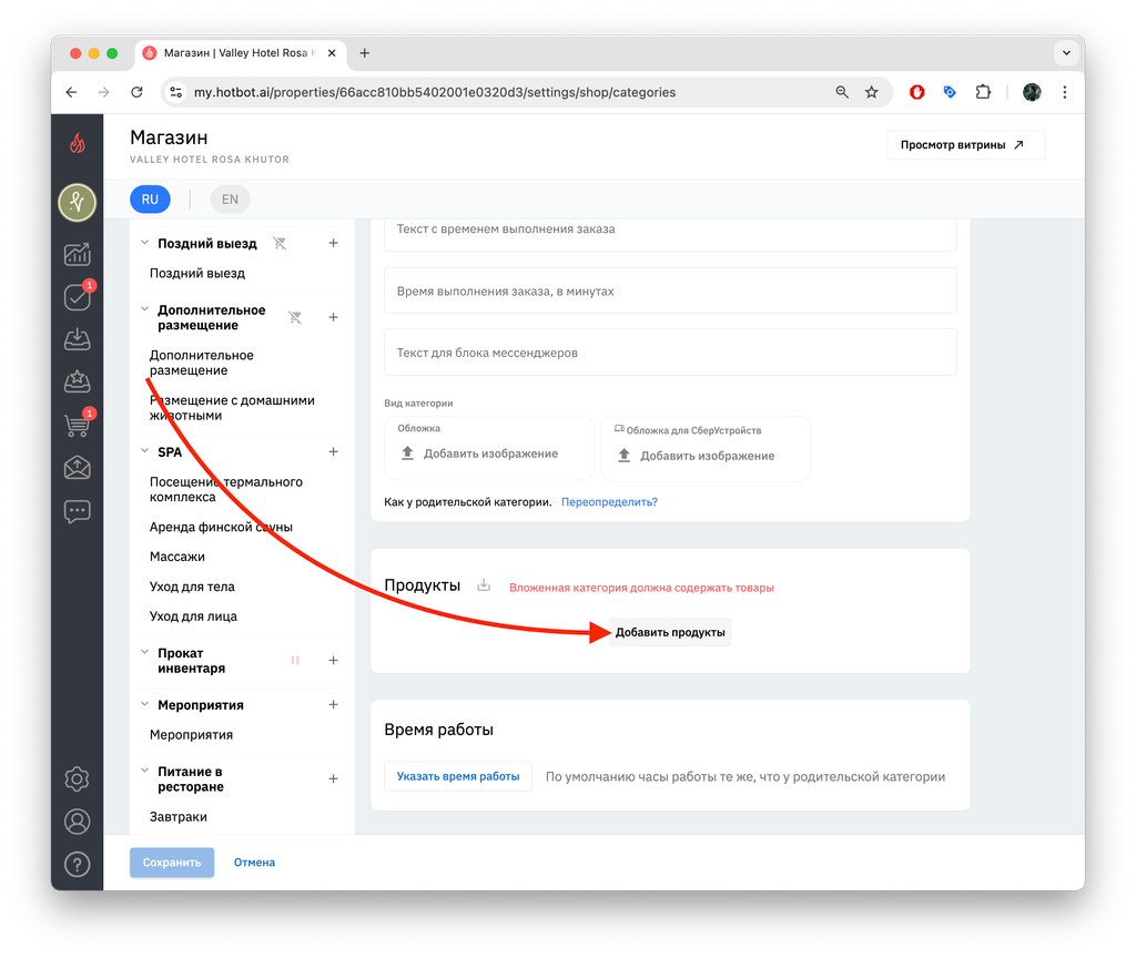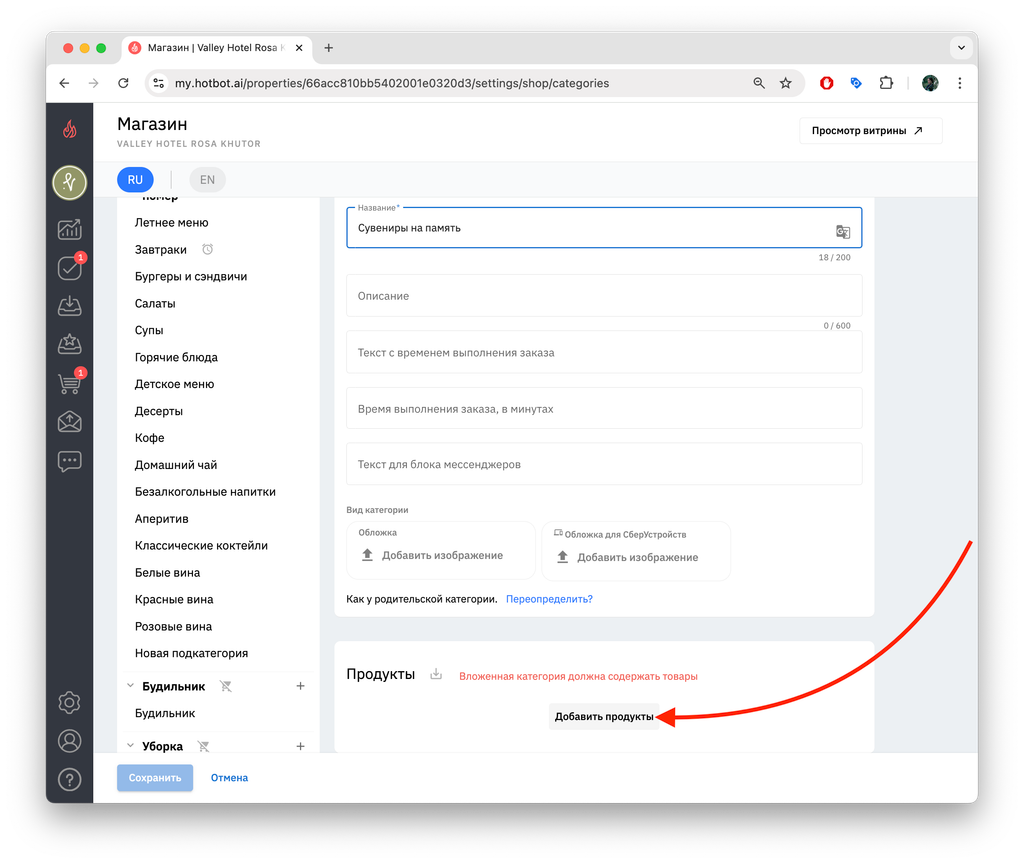 2. Добавьте в новую категорию продукты, которые будут выставляться на витрине Хотбот.