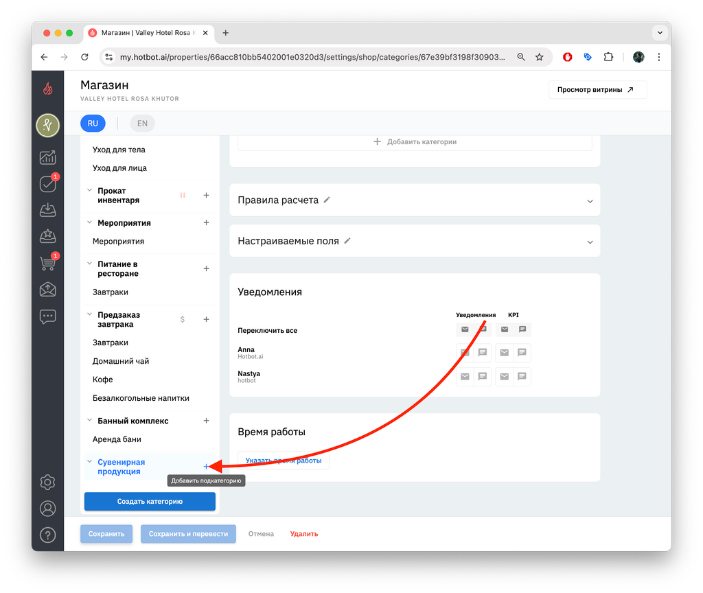 В новой категории добавьте подкатегорию для товаров. Рядом с названием категории нажмите +