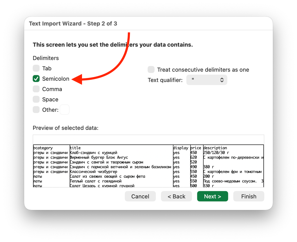 - Разделитель: Точка с запятой (Semicolon)