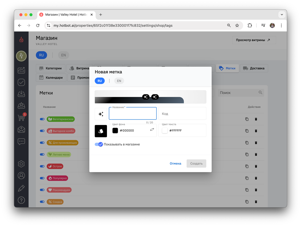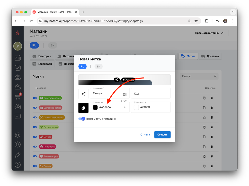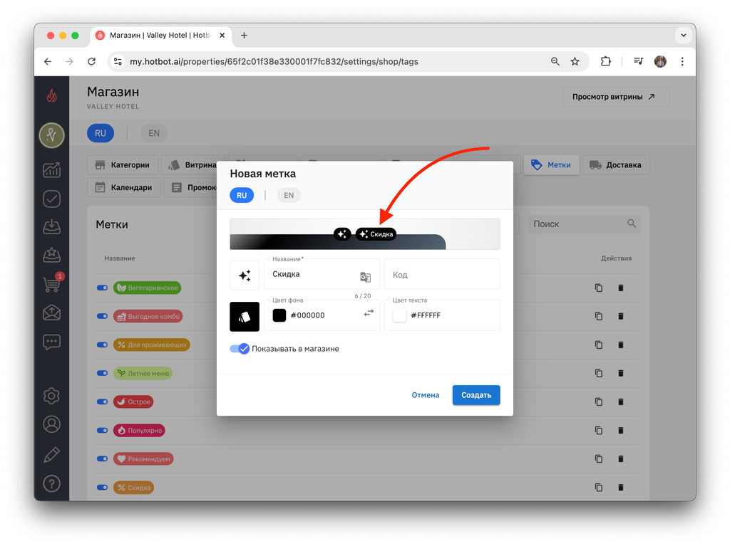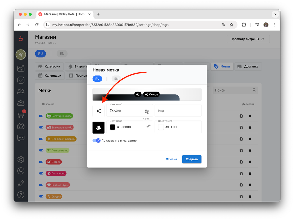 - В открывшемся окне вы можете заполнить название, выбрать иконку для метки, настроить цвет фона и цвет текста , а также временно скрыть метку, с помощью переключателя Показывать в магазине