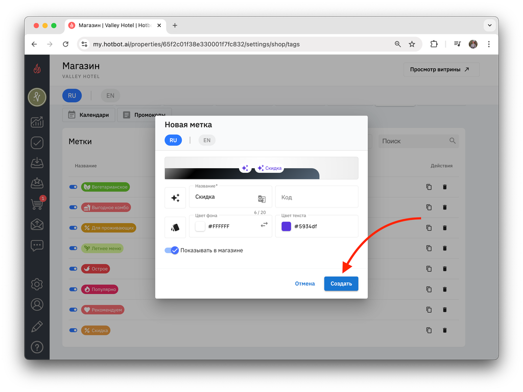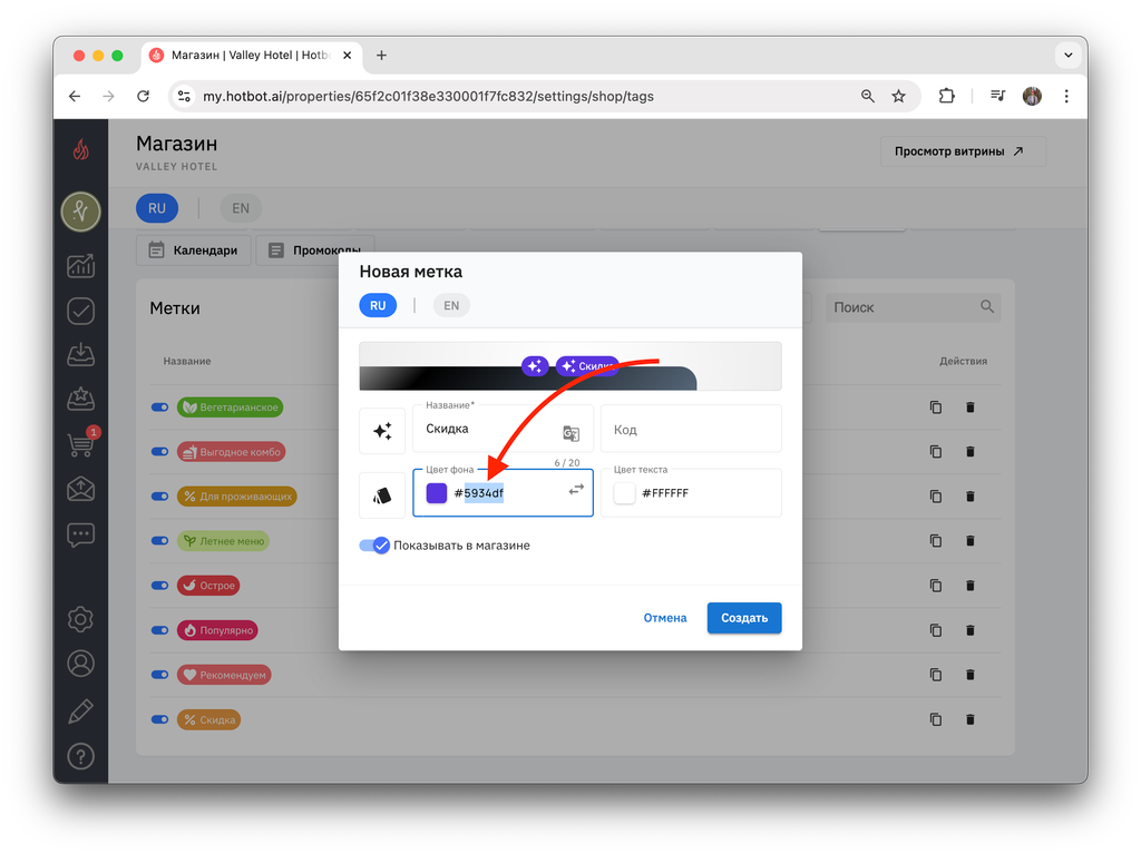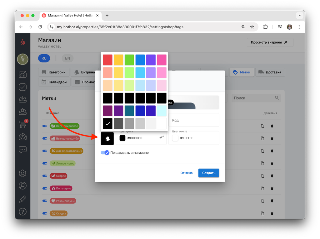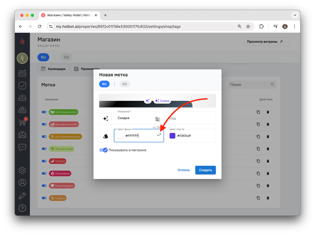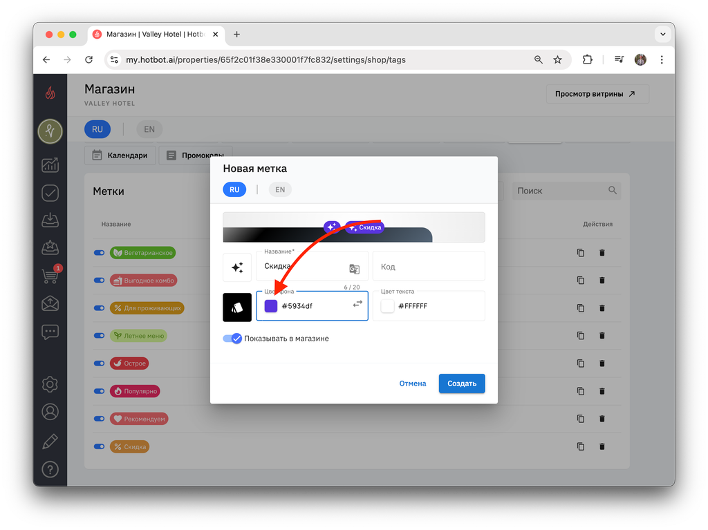 - В открывшемся окне вы можете заполнить название, выбрать иконку для метки, настроить цвет фона и цвет текста , а также временно скрыть метку, с помощью переключателя Показывать в магазине
