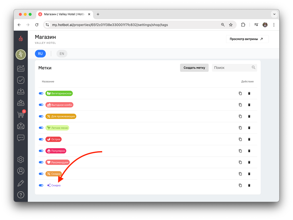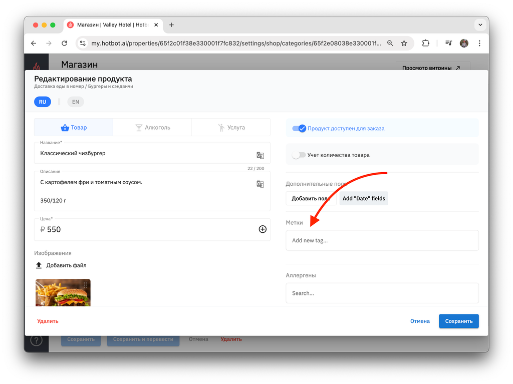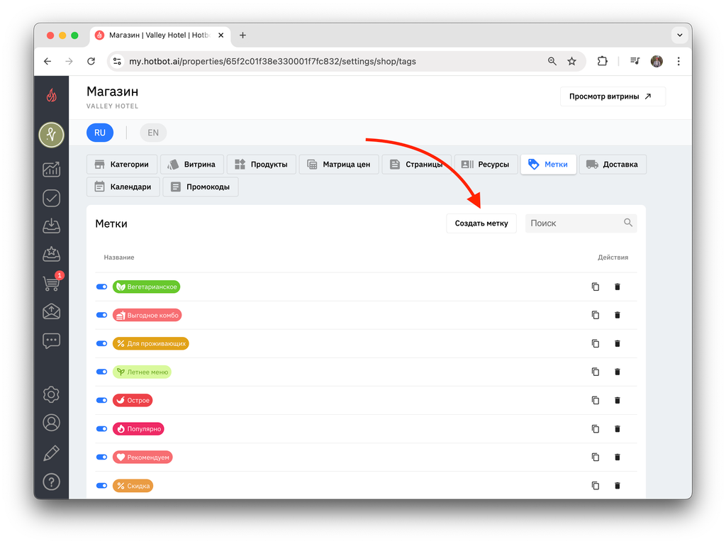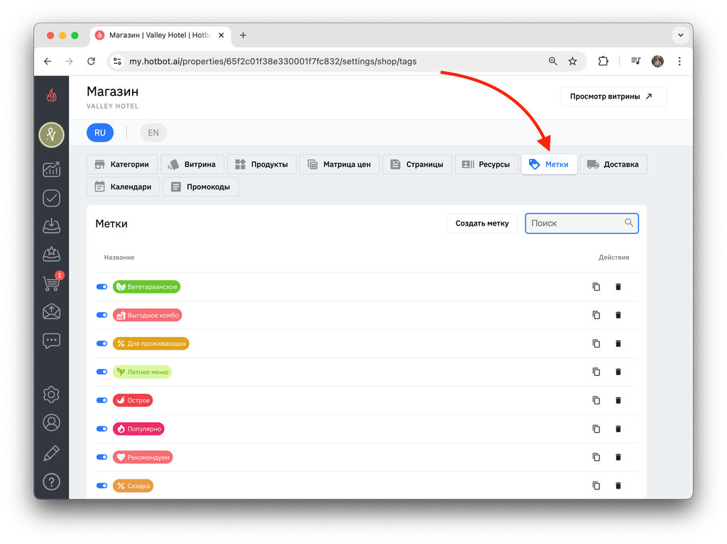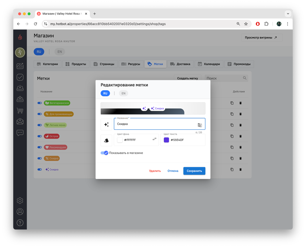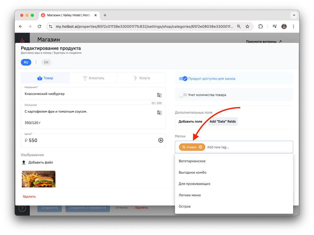 Метки — это цветные элементы с иконкой и текстом, которые можно добавлять к продуктам на витрине. Они помогают привлечь внимание гостей и выделить определенные товары, служа инструментом для информирования о свойствах или акциях на продукт или категорию продуктов.