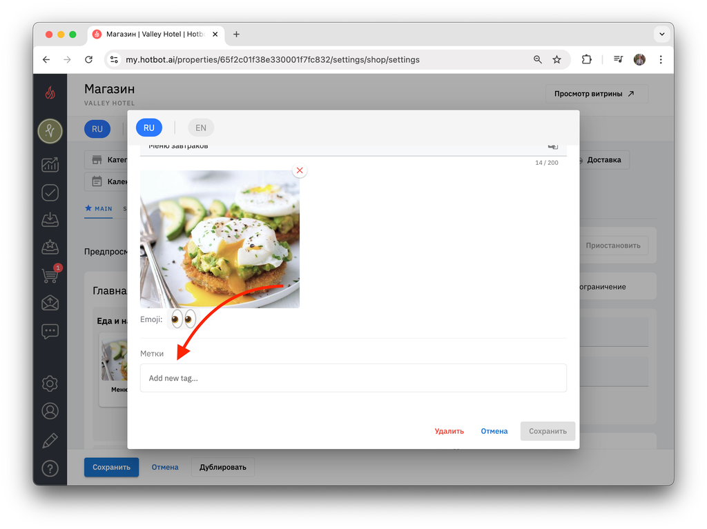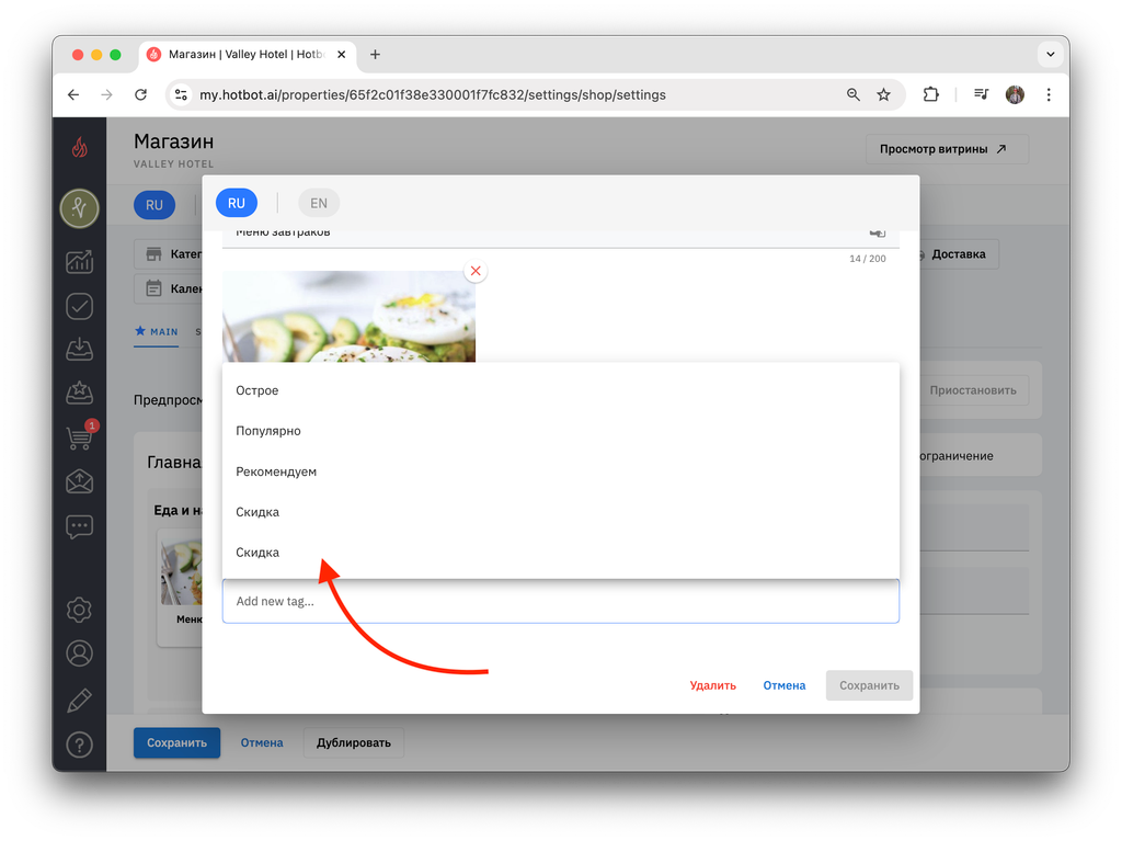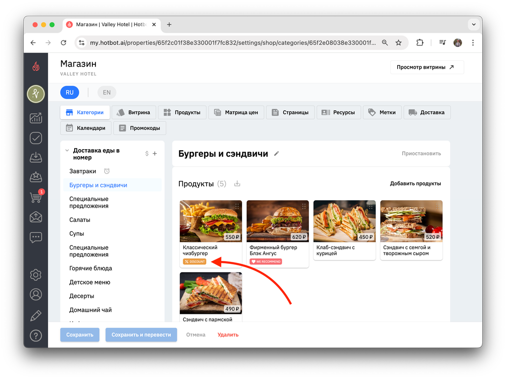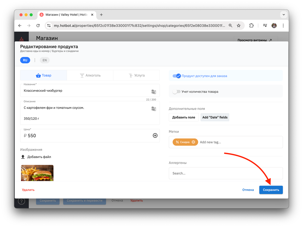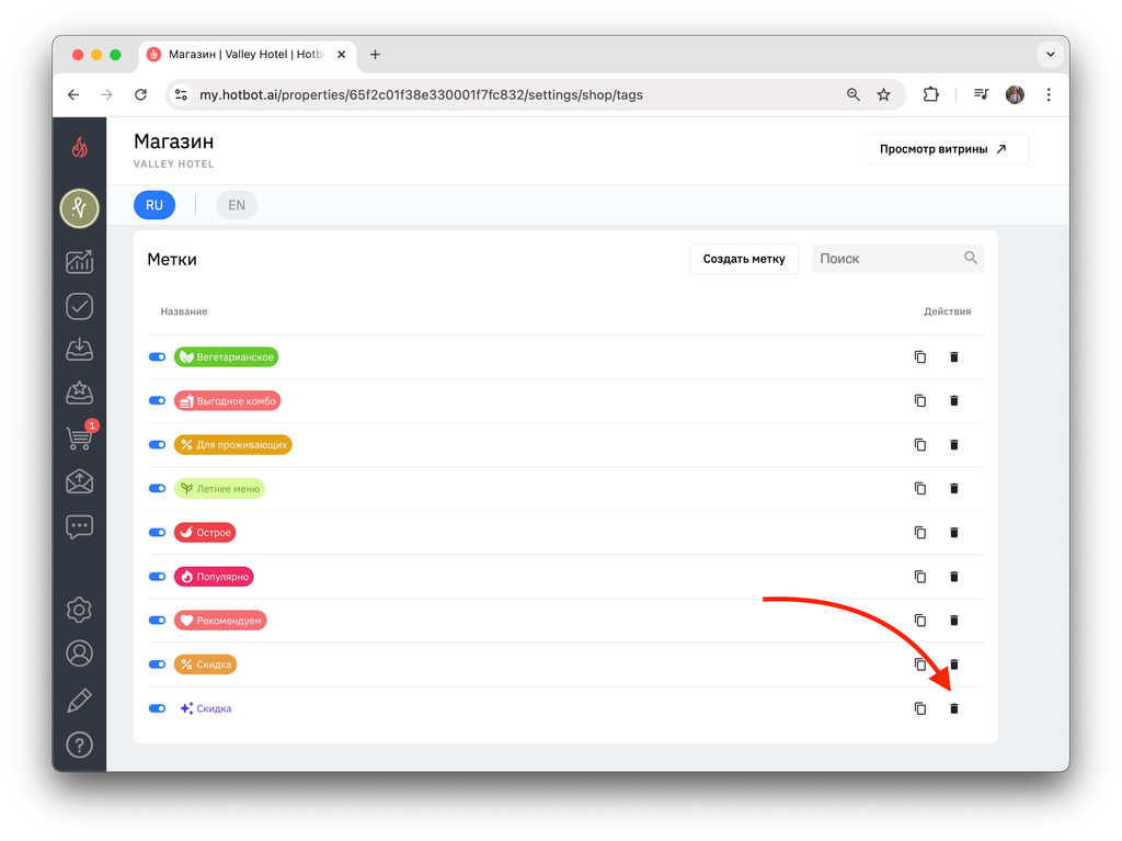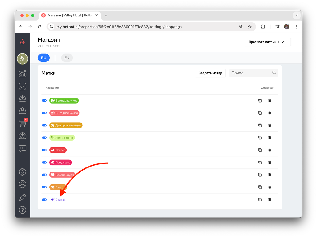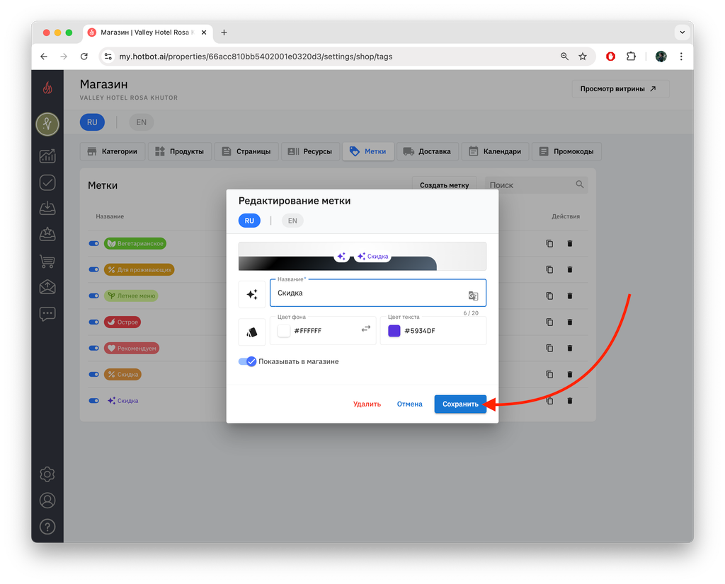 Метки — это цветные элементы с иконкой и текстом, которые можно добавлять к продуктам на витрине. Они помогают привлечь внимание гостей и выделить определенные товары, служа инструментом для информирования о свойствах или акциях на продукт или категорию продуктов.