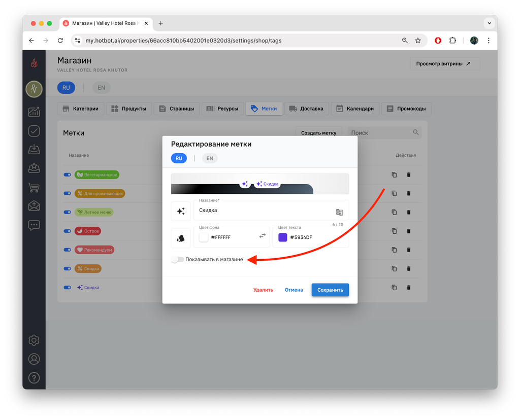 Вы также можете временно скрыть метку, воспользовавшись переключателем Показывать в магазине