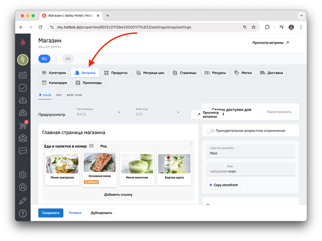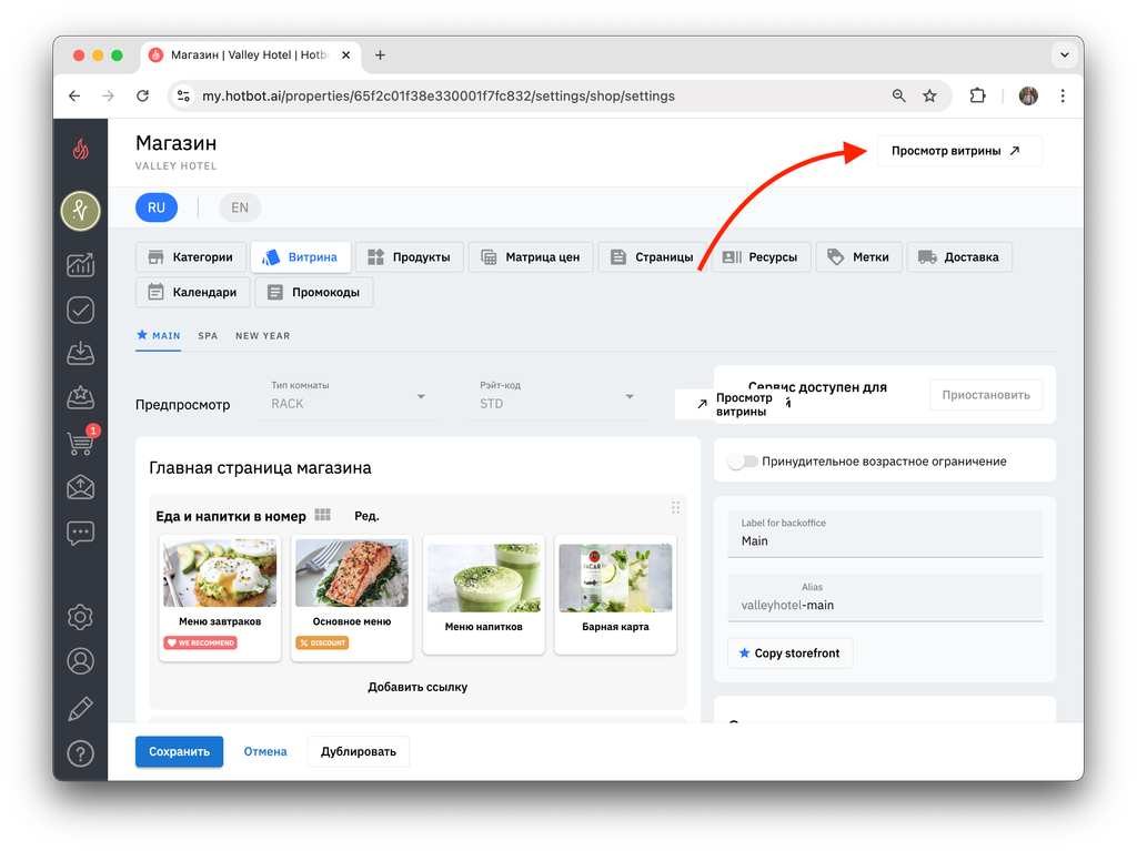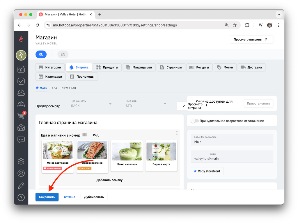 Далее нажмите Сохранить в нижнем левом углу страницы, чтобы сохранить настройки витрины.