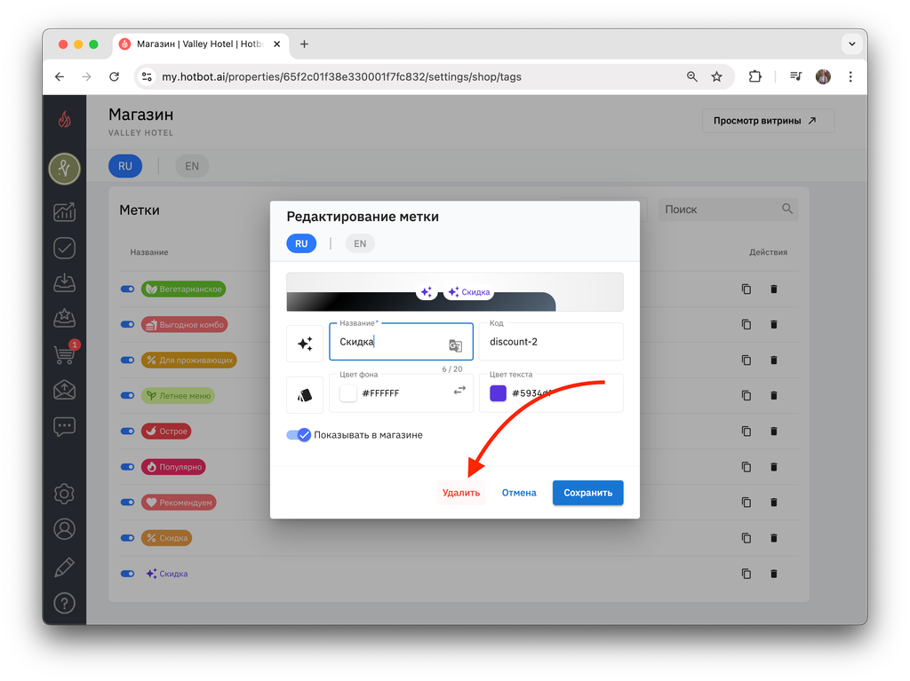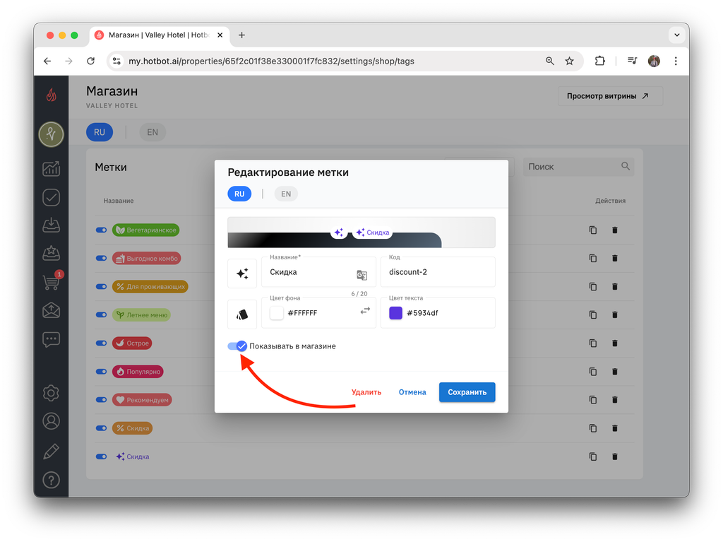 В открывшемся окне вы можете изменить название, иконку, цвет фона и текста, а также временно скрыть метку, с помощью переключателя Показывать в магазине