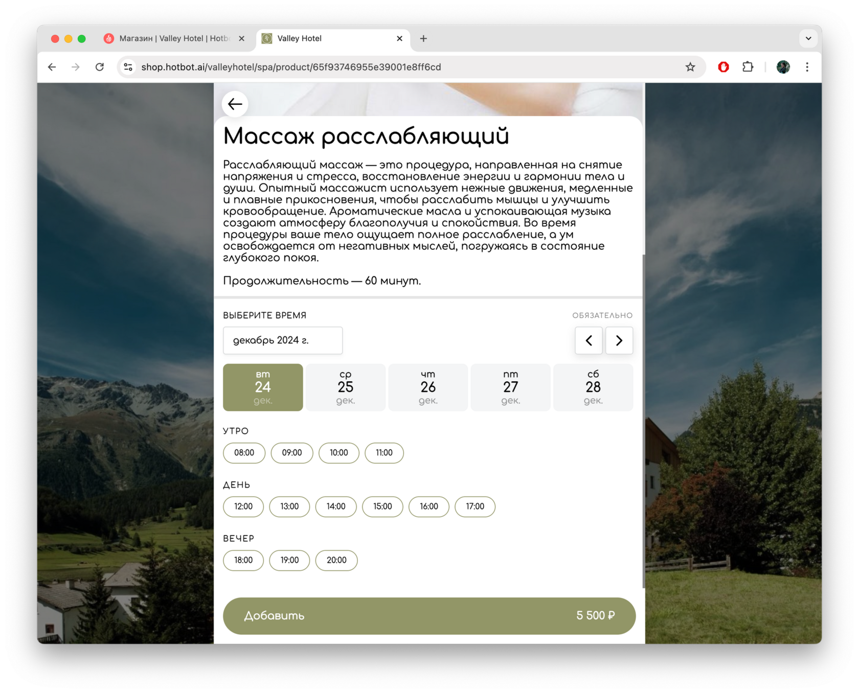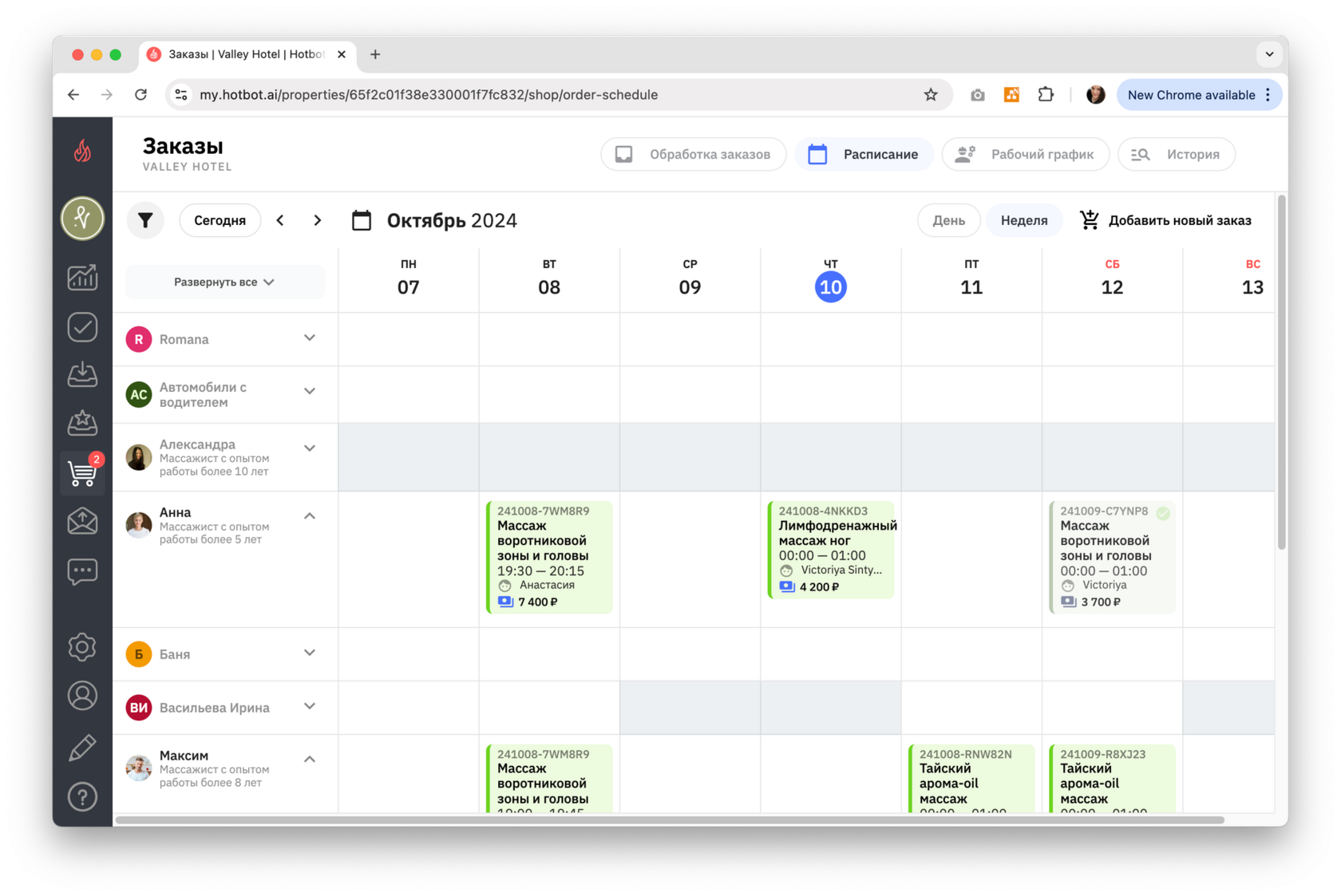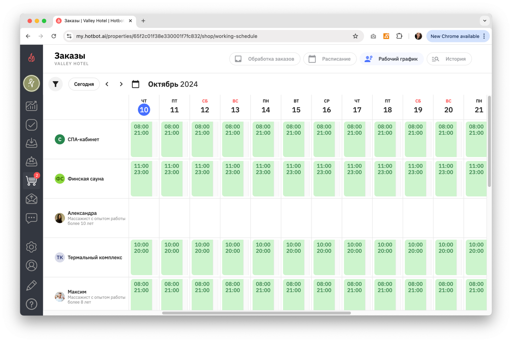 В отличие от стандартного формата заказа с пожеланиями по дате и времени, в шахматке гость может выбрать доступный временной слот согласно актуальному расписанию и забронировать услугу на это время.