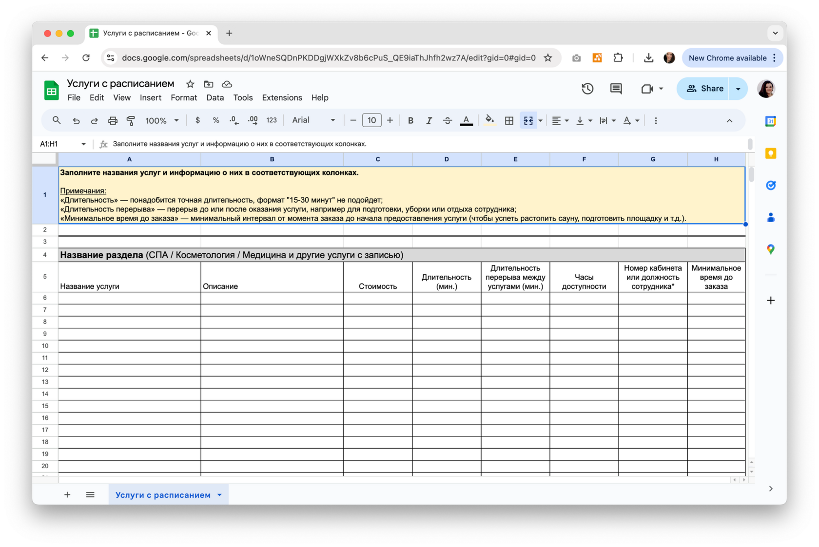 С точки зрения информации о ваших услугах, мы попросим вас заполнить сводную таблицу, которая отличается от стандартных прайсов и меню тем, что в ней указываются дополнительные параметры для настройки расписания.