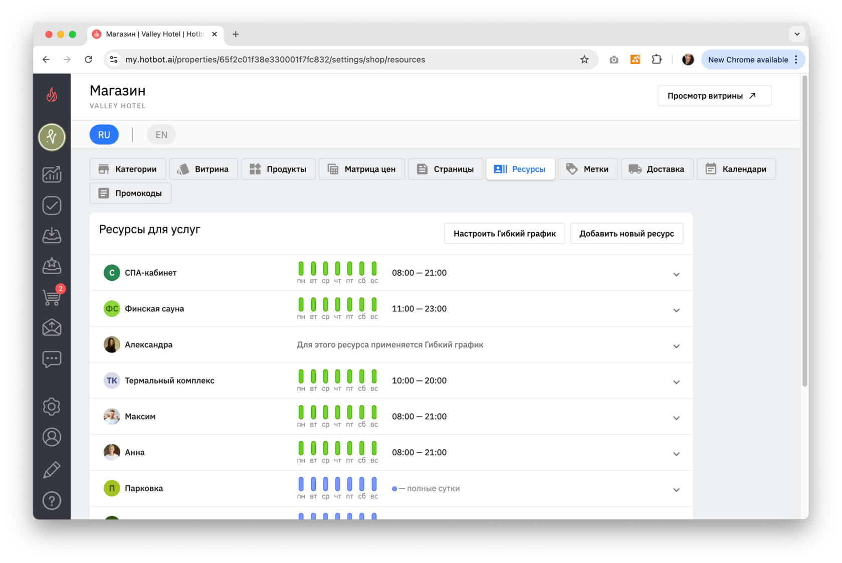 - Раздел Расписание в магазине и раздел Рабочий график в расписании для настройки дат и часов доступности сотрудников и ресурсов.