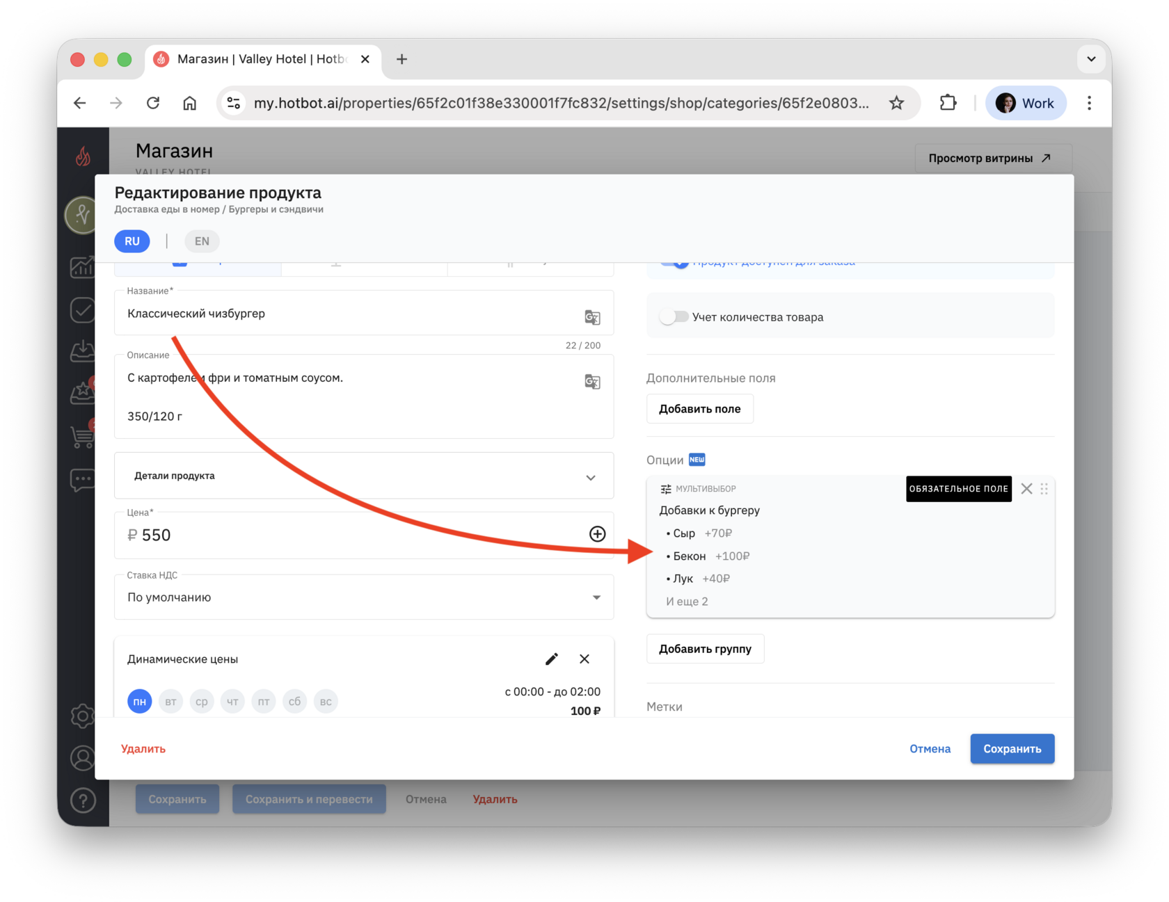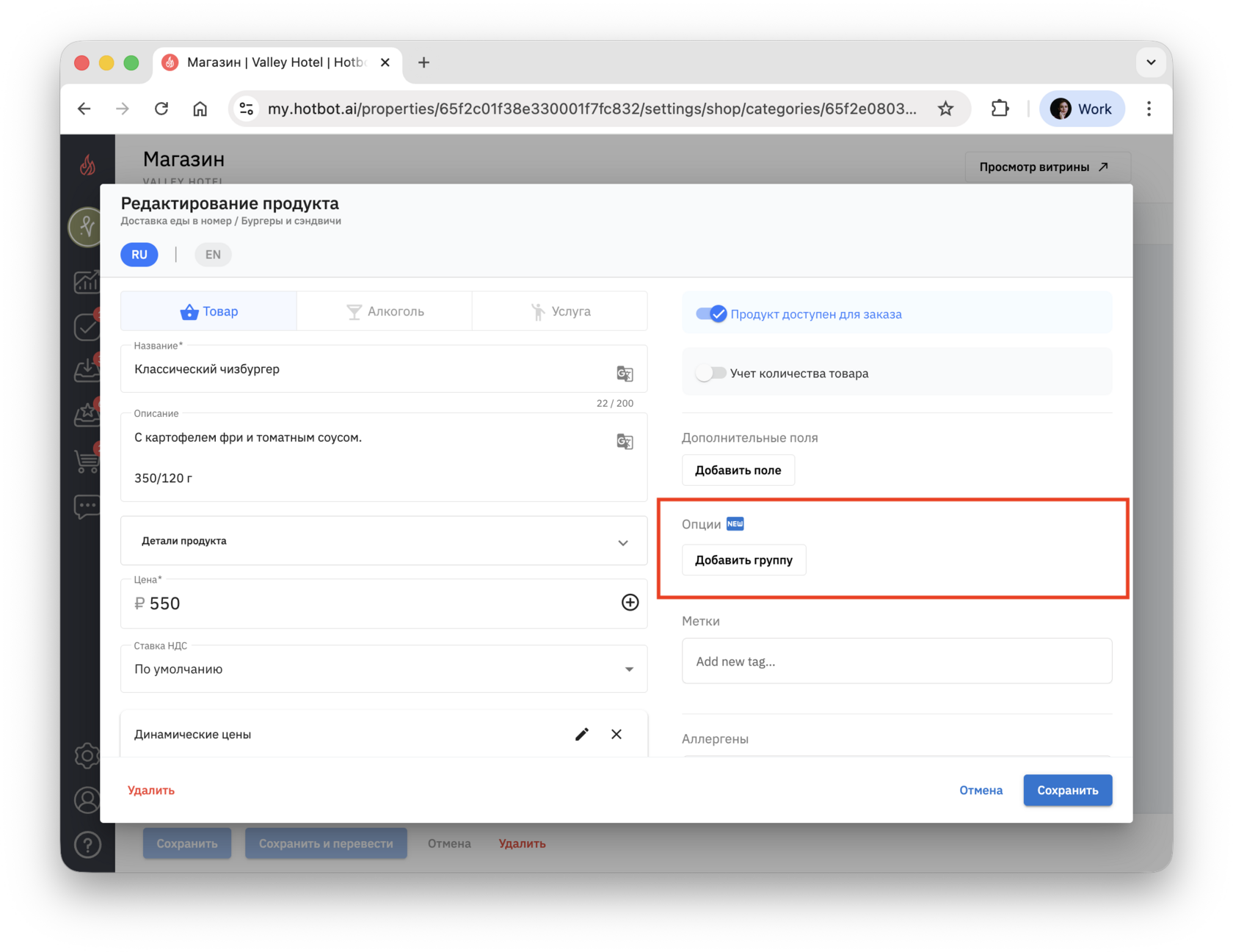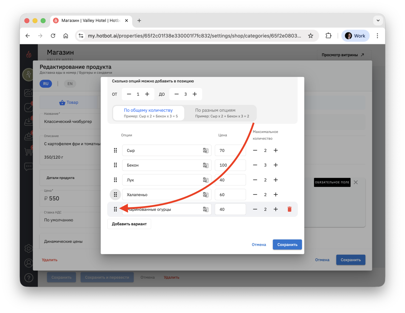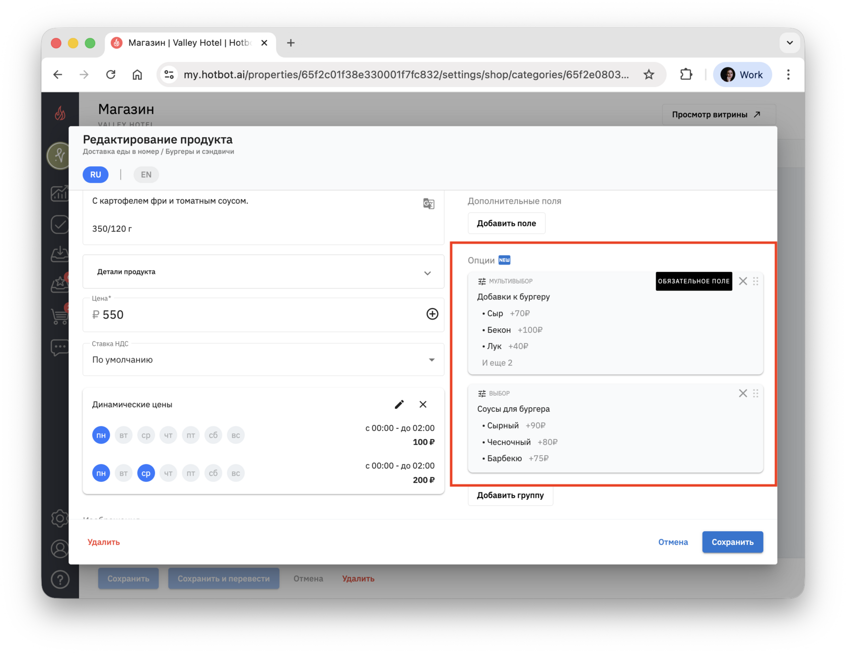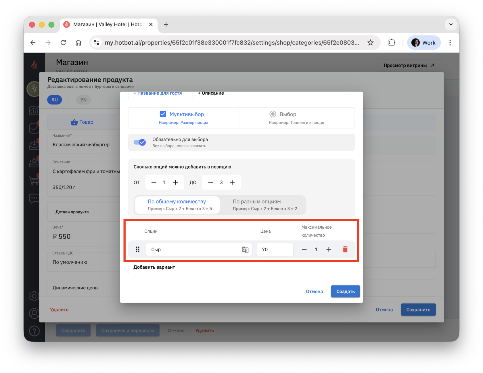 Опции — это дополнительные варианты внутри товара, которые гость может выбрать бесплатно или за доплату.