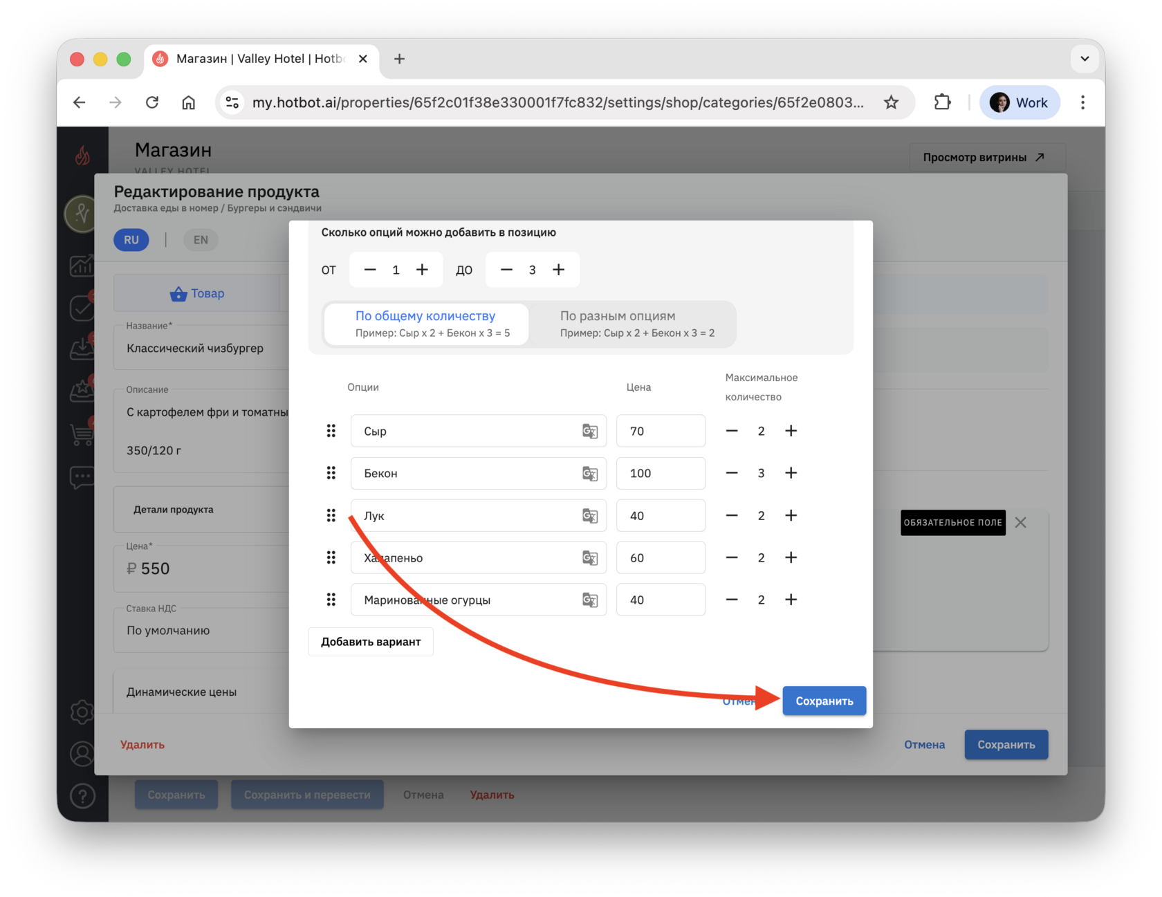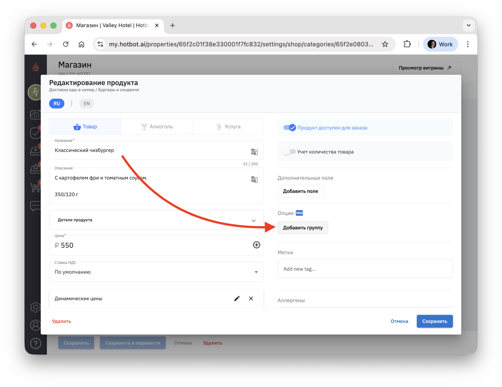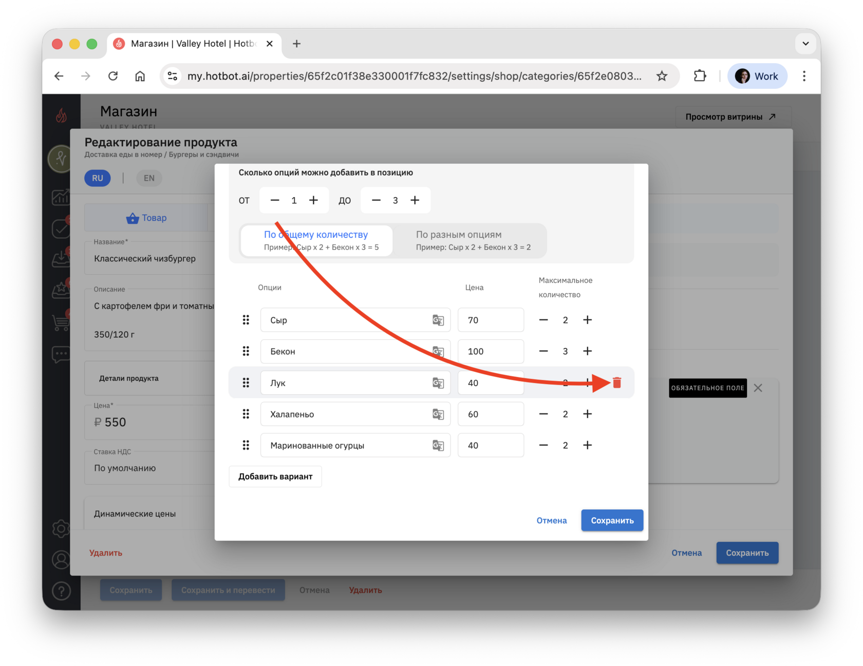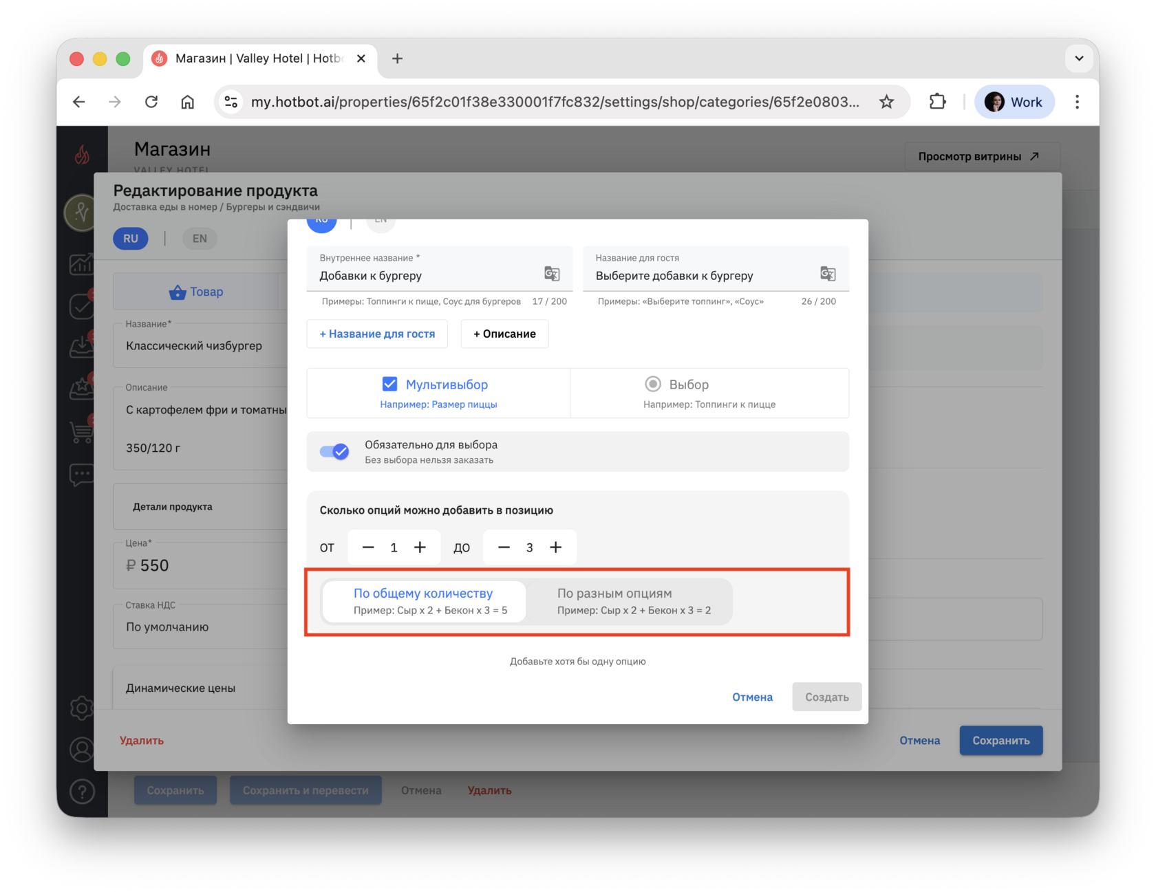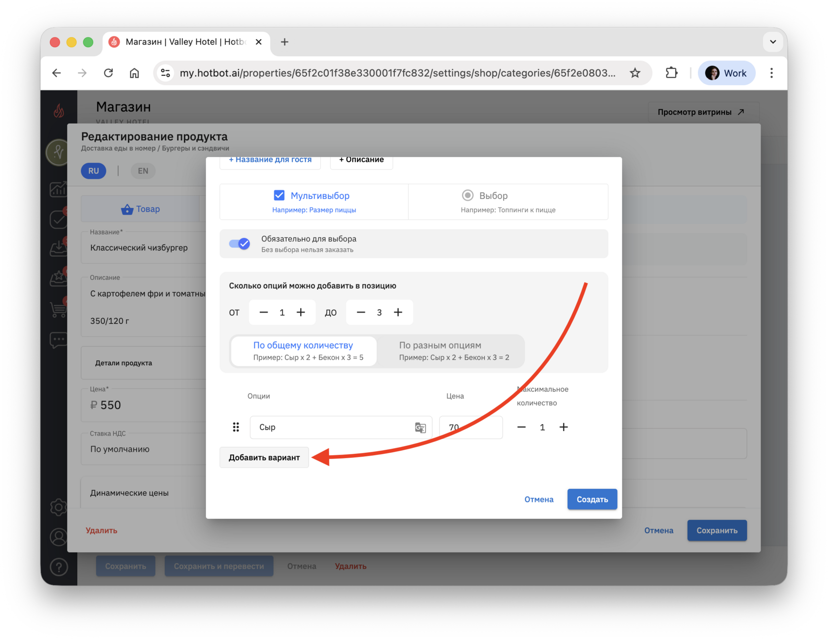 Опции — это дополнительные варианты внутри товара, которые гость может выбрать бесплатно или за доплату.
