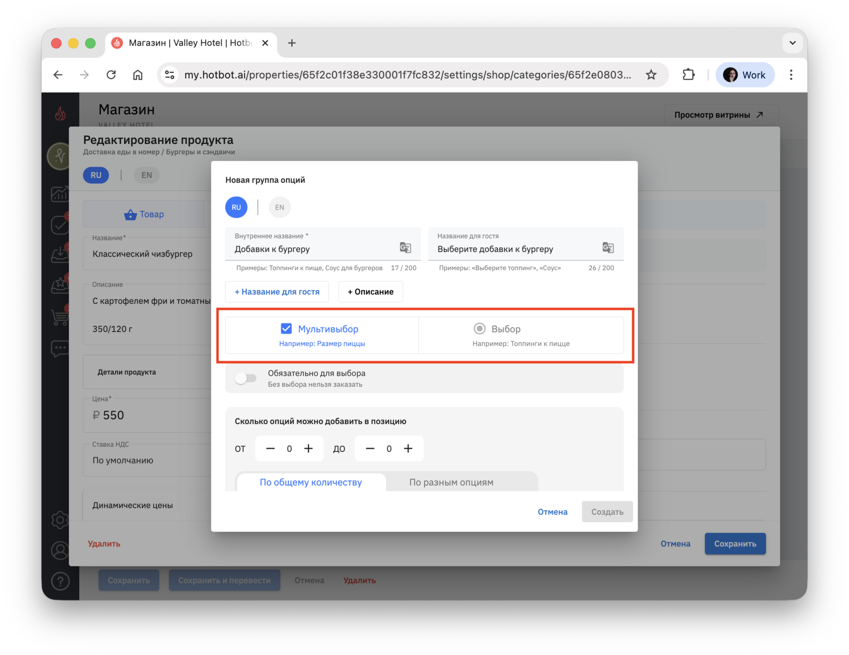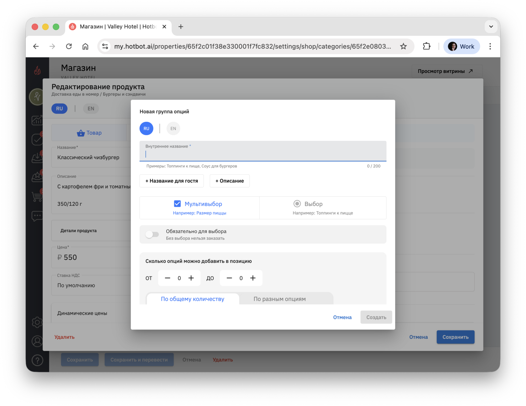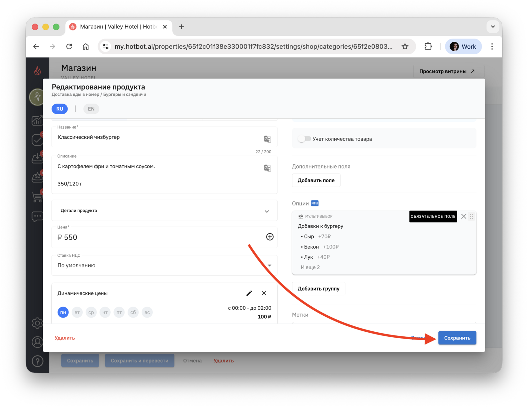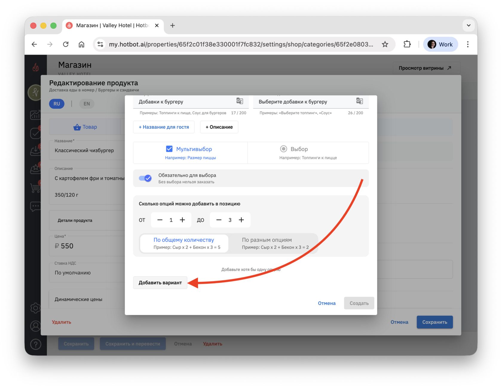 Опции — это дополнительные варианты внутри товара, которые гость может выбрать бесплатно или за доплату.