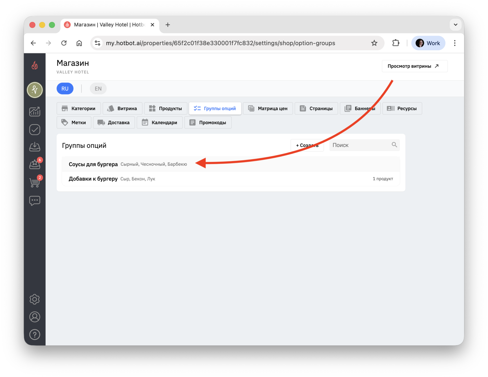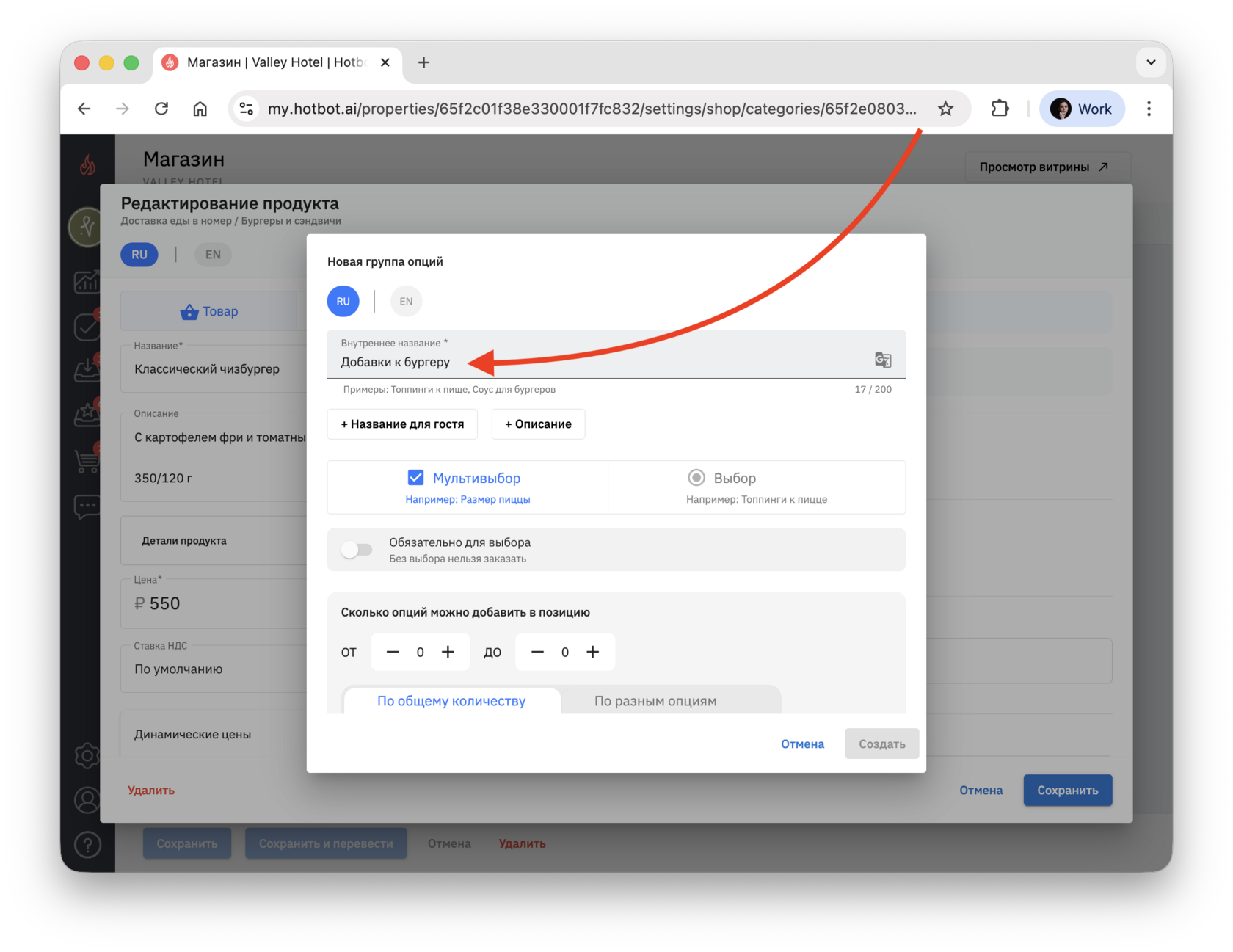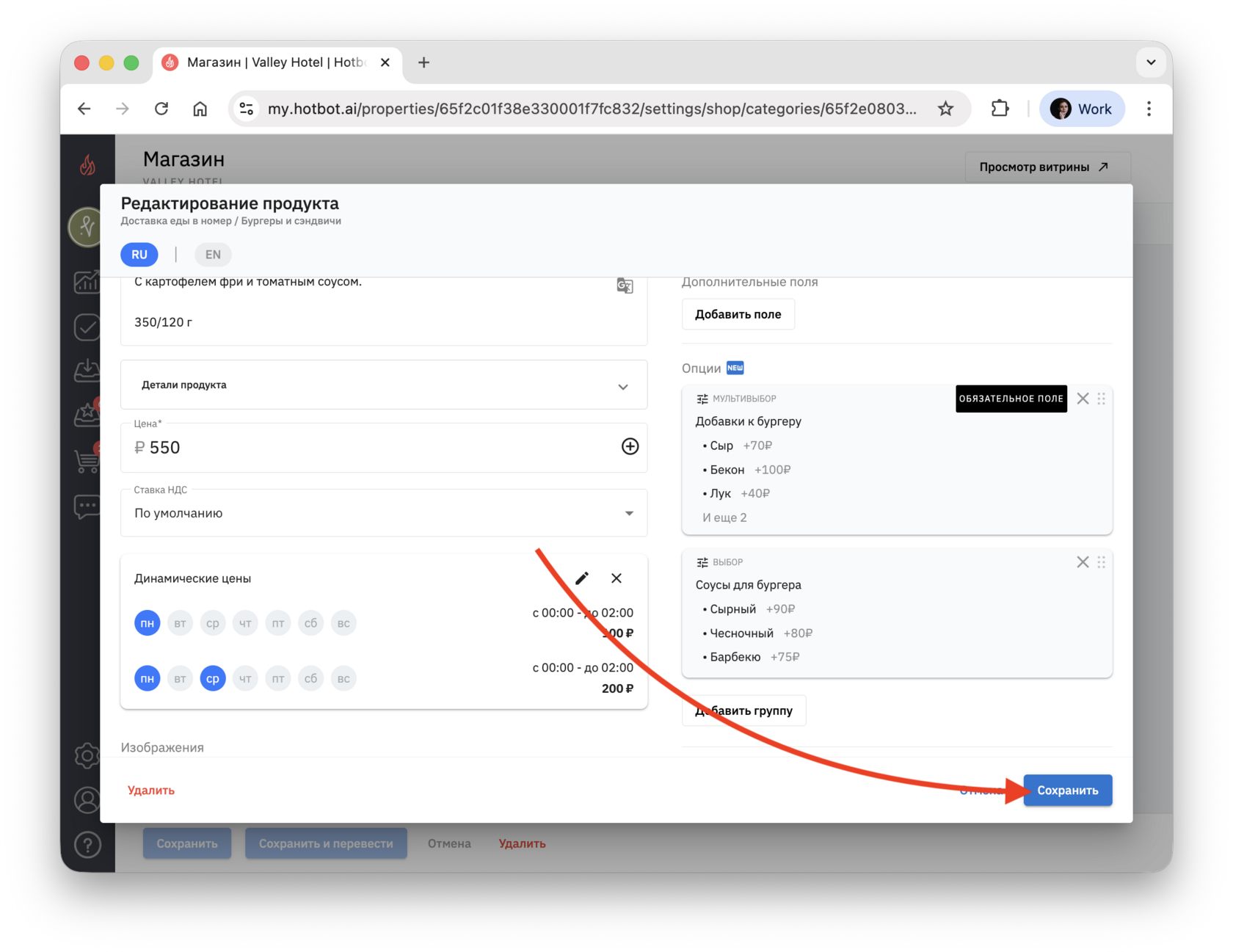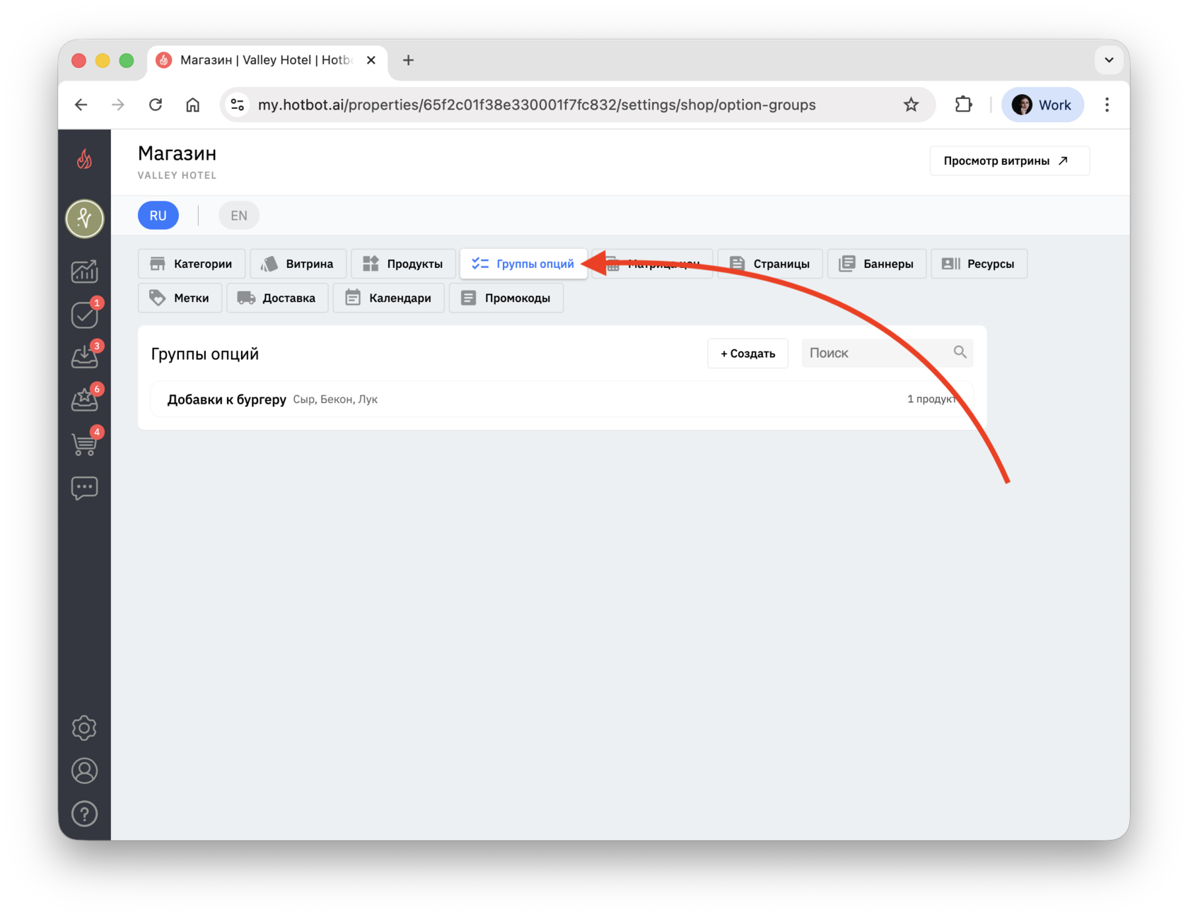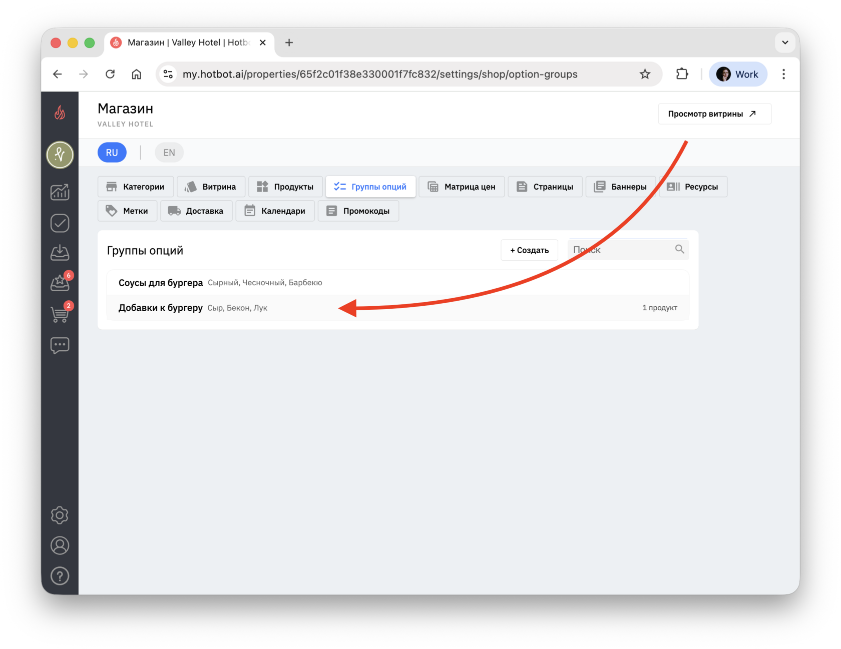 Опции — это дополнительные варианты внутри товара, которые гость может выбрать бесплатно или за доплату.
