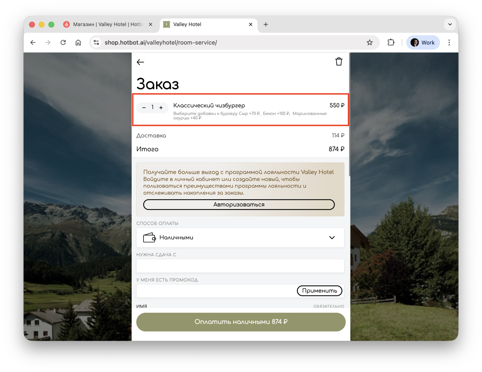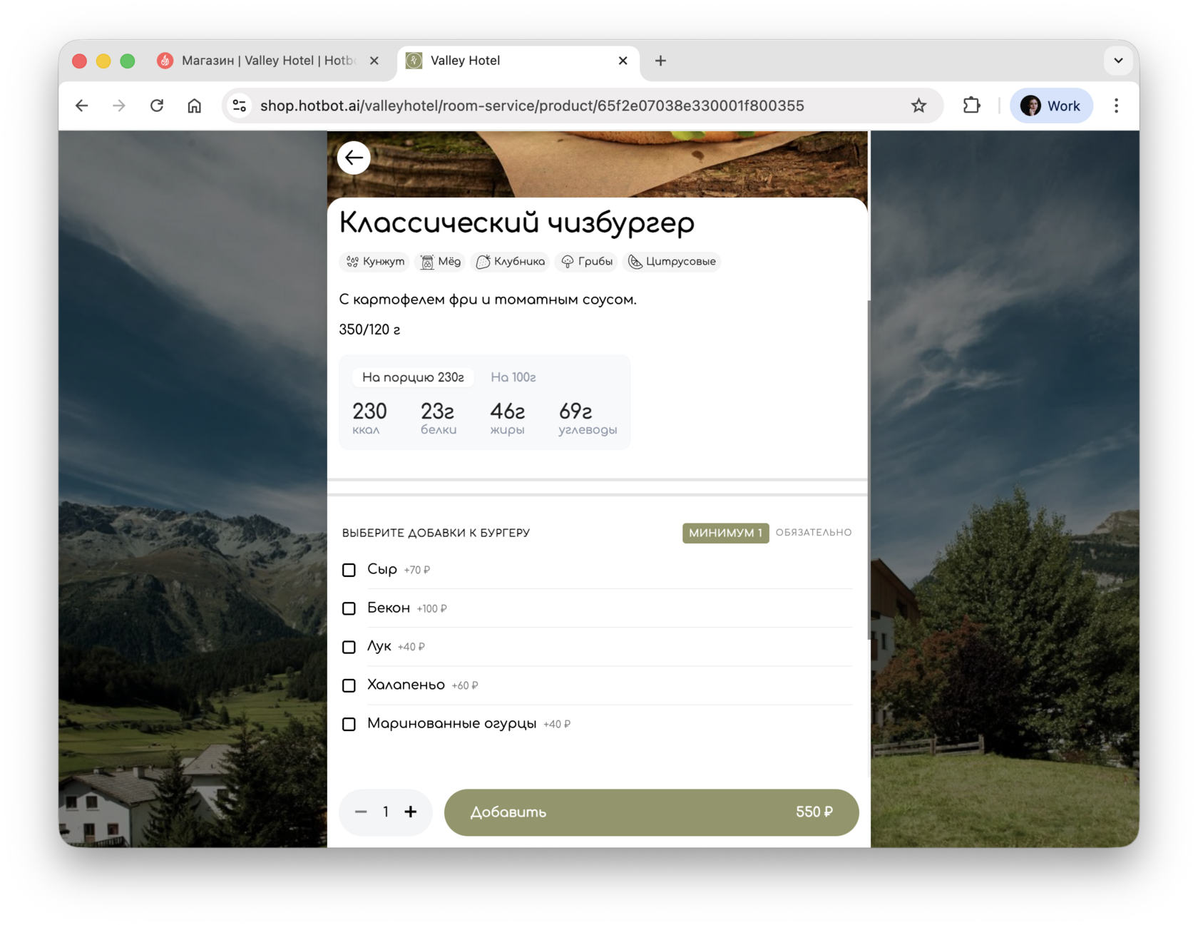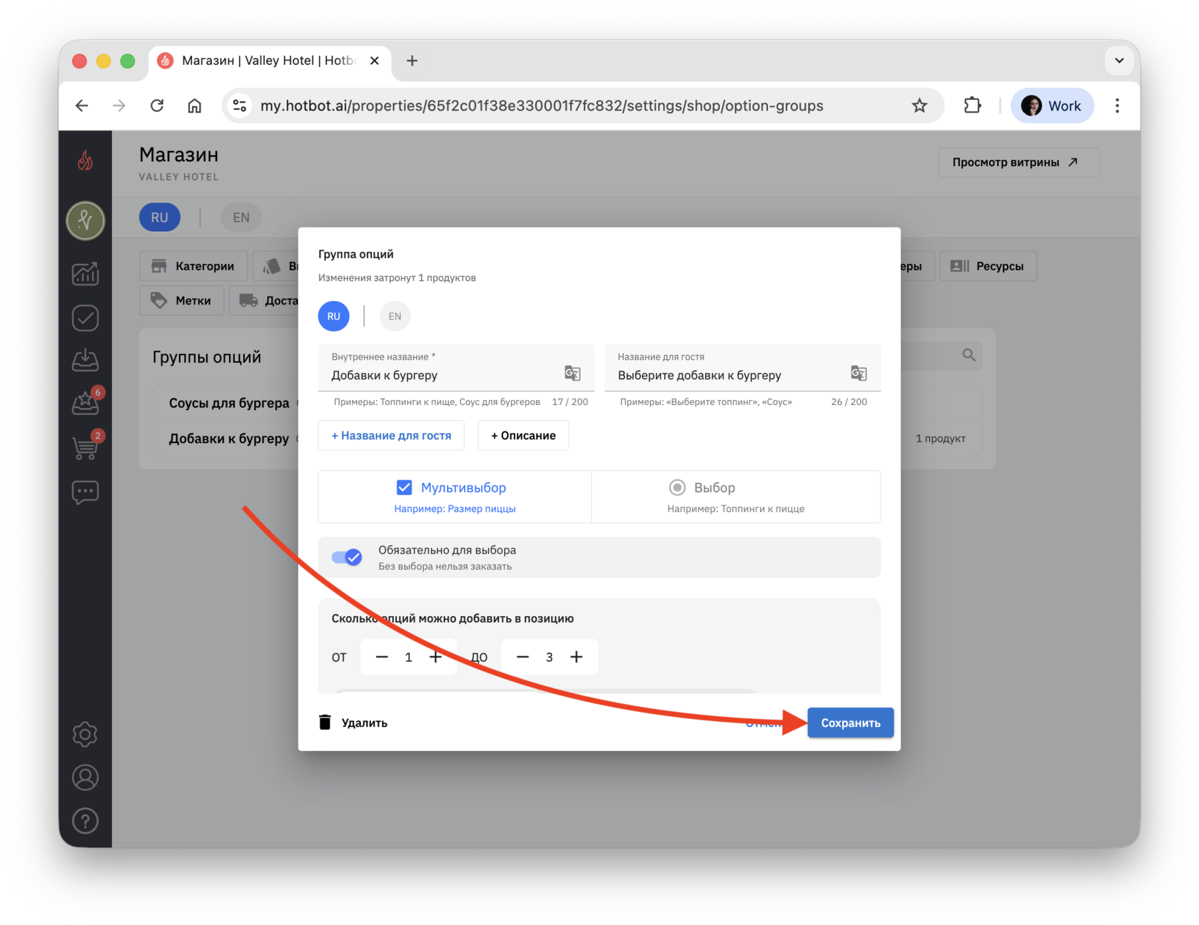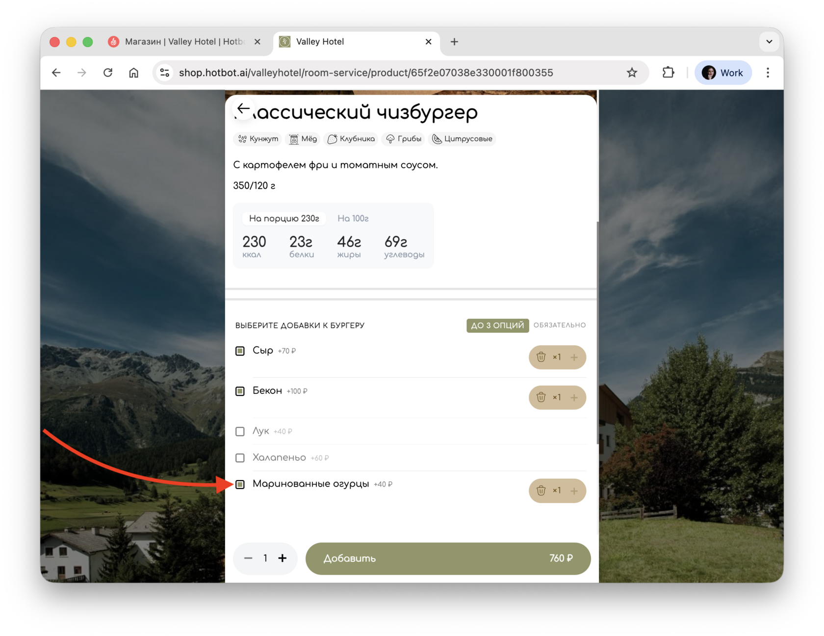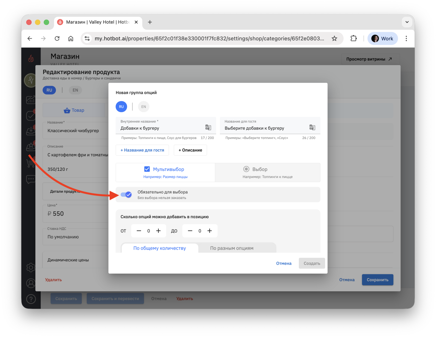 Подсказки на витрине показывают ограничения, например: «Минимум 1». Это значит, что, пока гость не выберет хотя бы один вариант, он не сможет добавить товар в корзину.