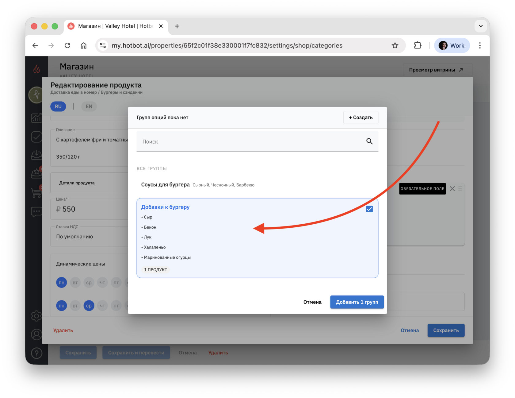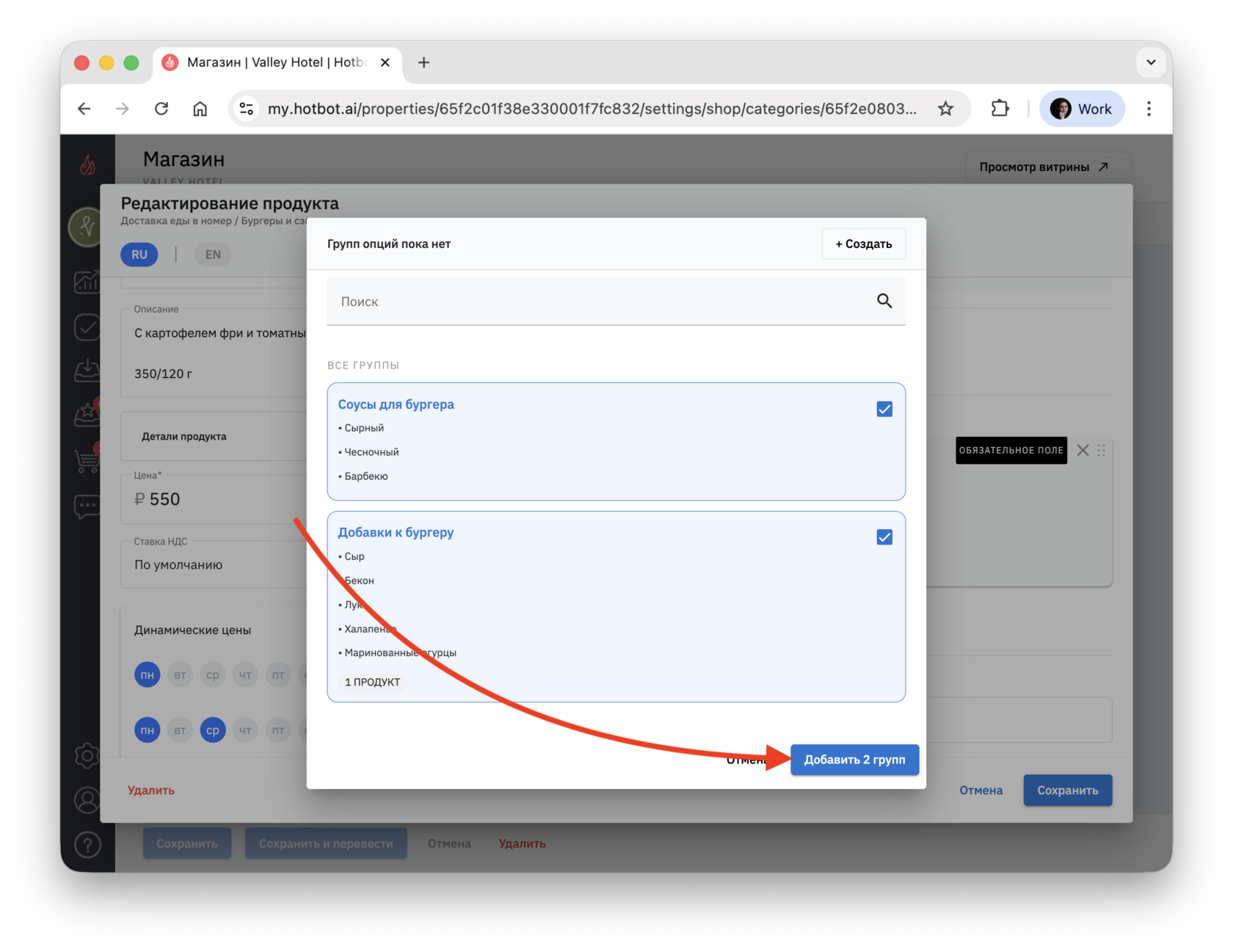 5. Выберите все группы опций, которые необходимо добавить к товару.