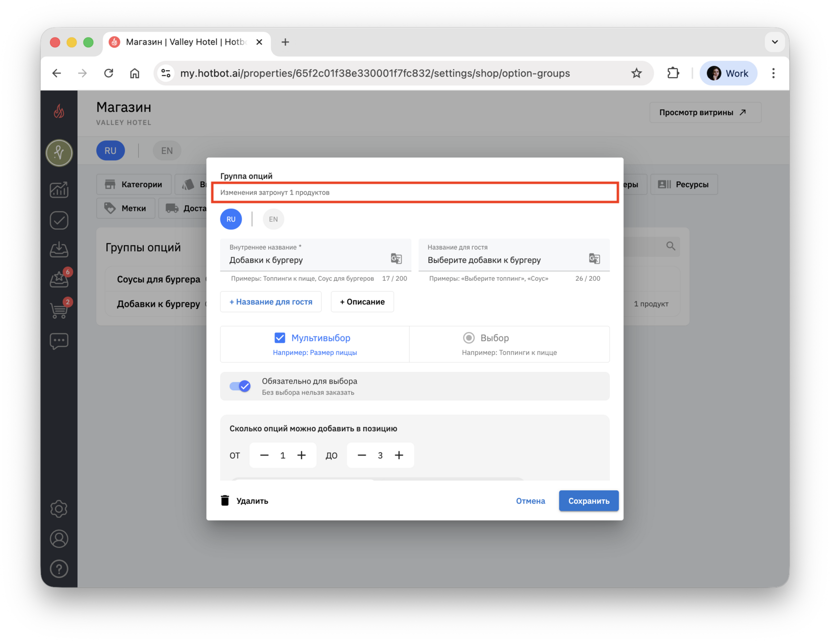 В верхней части окна отображается уведомление: «Изменения затронут N продуктов», где N — количество продуктов, в которых изменятся опции.