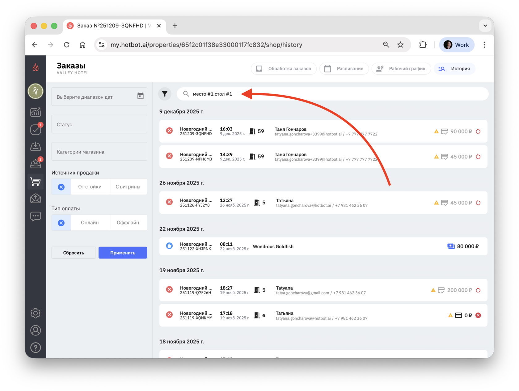 Поиск по столу помогает быстро отфильтровать нужные заказы — например, когда нужно проверить бронирования на конкретный стол в ресторане.