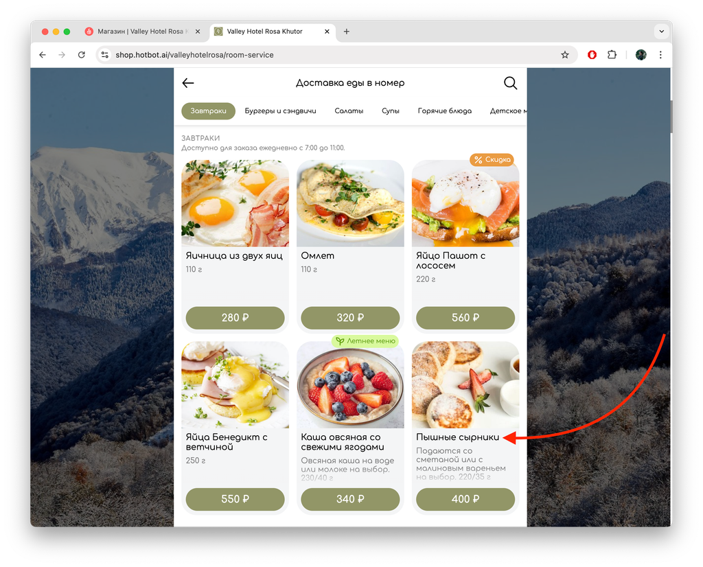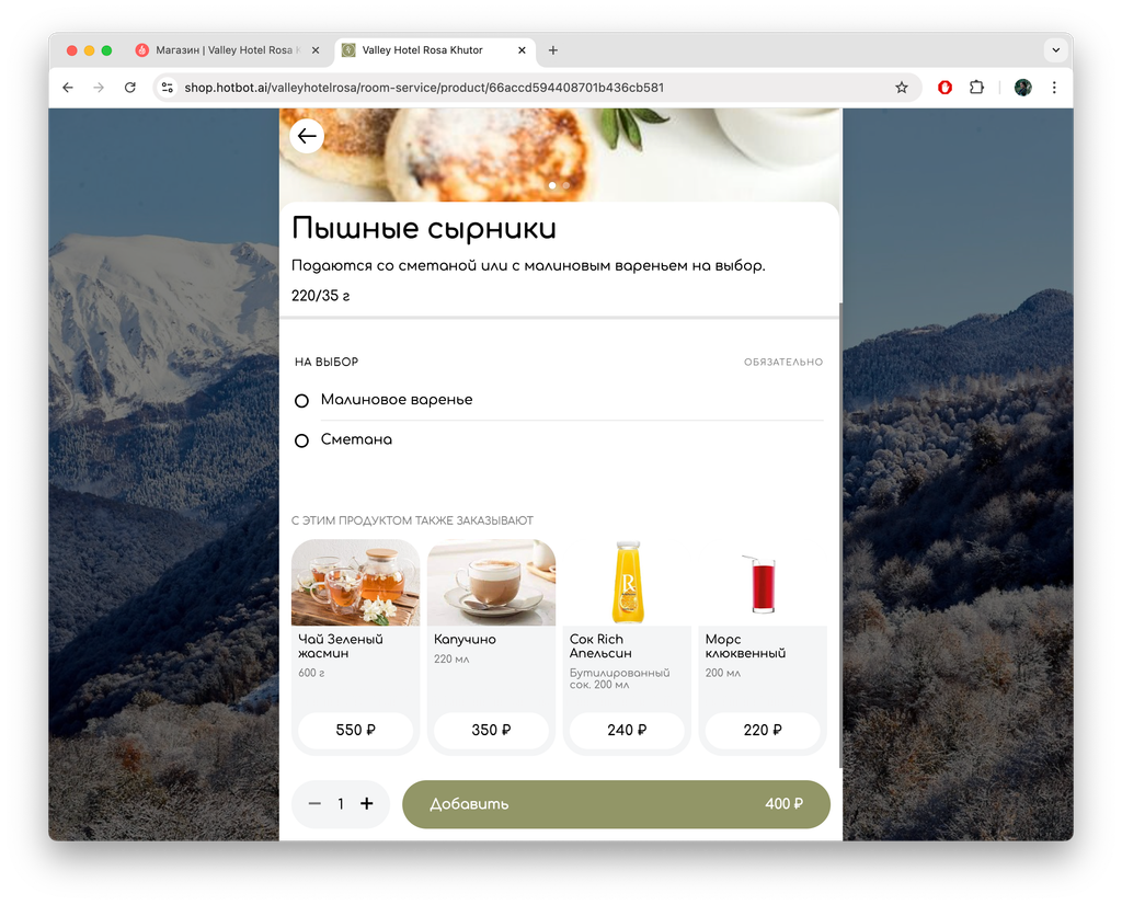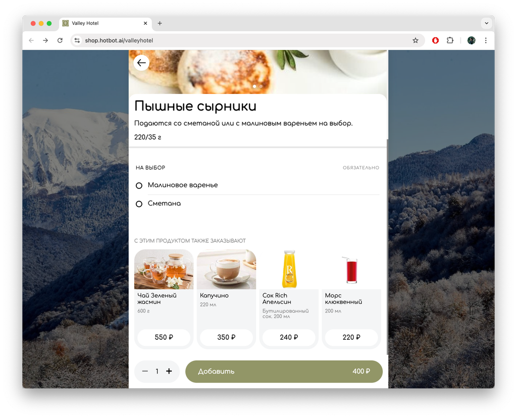 Когда гость заходит на страницу продукта на витрине, он видит блок С этим продуктом также заказывают, в котором отображаются рекомендуемые вами позиции. Если позиции хорошо сочетаются и привлекательно выглядят, гость добавит в корзину больше позиций, чем планировал или мог бы добавить при отсутствии этого блока.