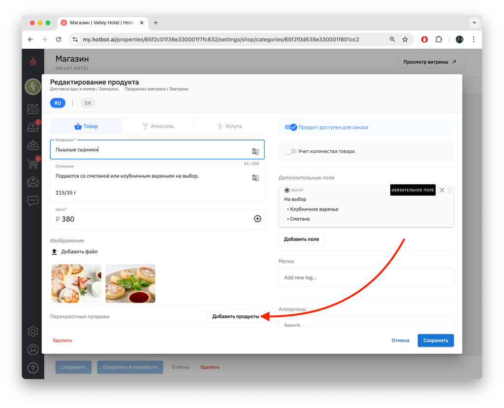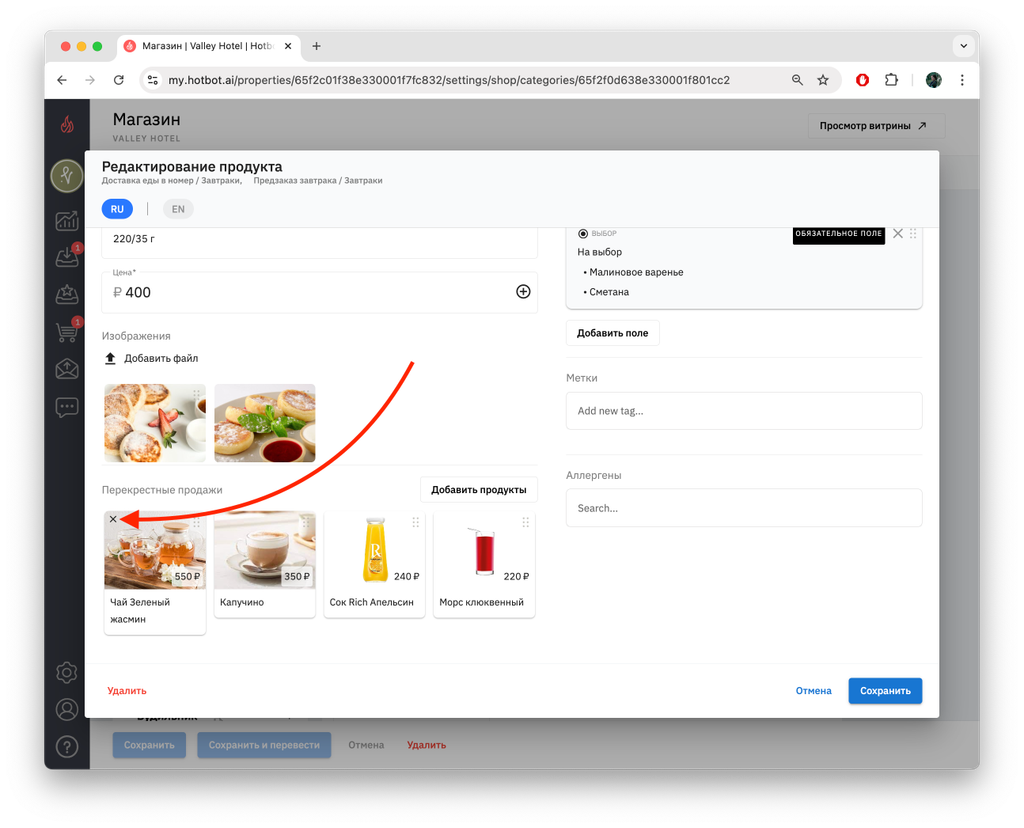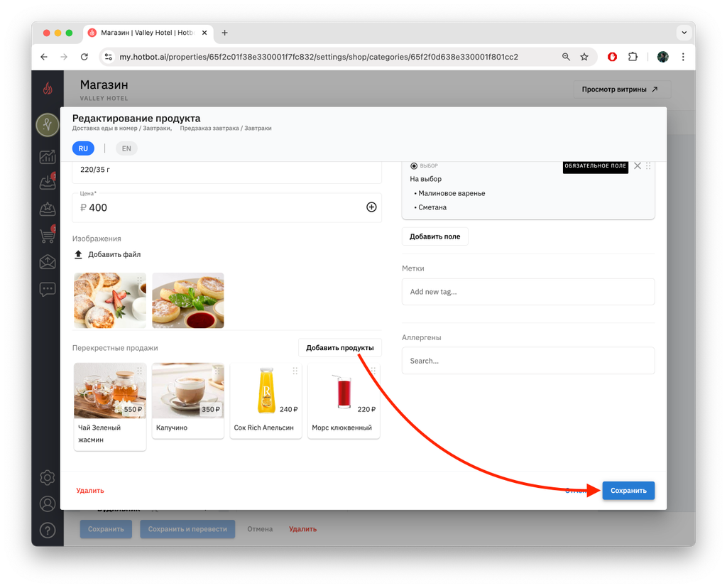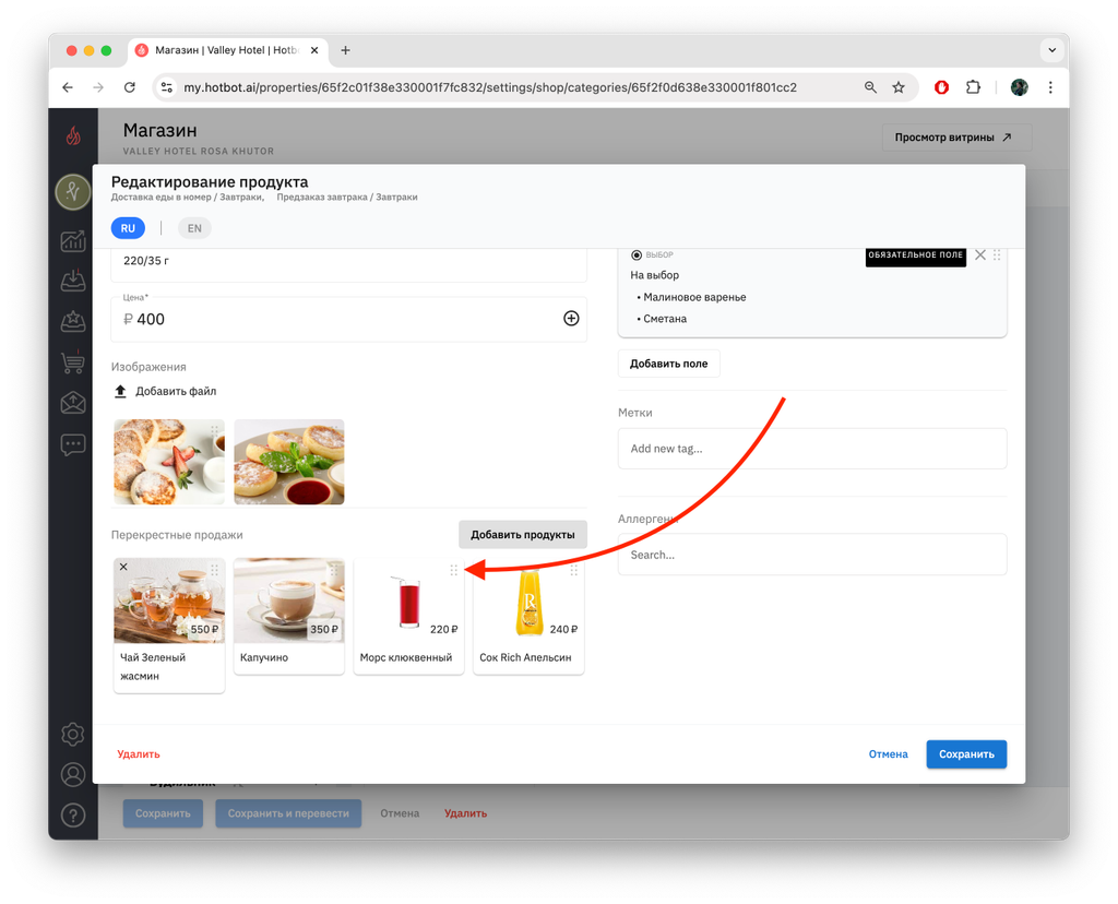В карточке продукта в блоке Перекрестные продажи вы увидите добавленные продукты. Нажмите Сохранить