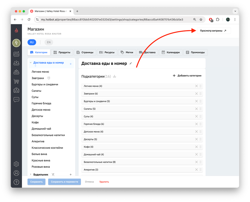 Чтобы проверить, как гость видит рекомендации на витрине, со страницы магазина перейдите к Просмотру витрины