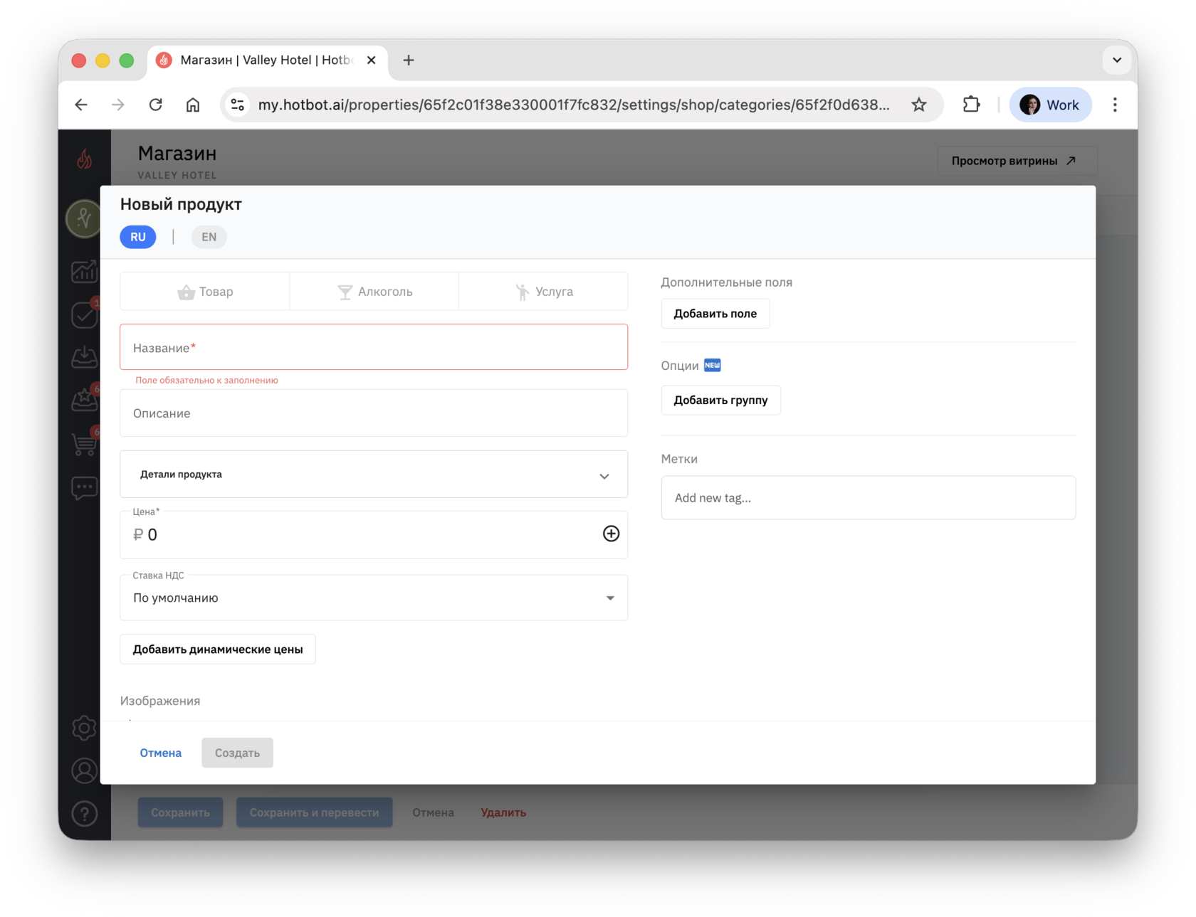 Продукты — это карточки, представляющие все товары и услуги, предлагаемые в магазине вашего отеля. Эти карточки включают описание, цену и другие параметры. После настройки продукты отображаются на витрине, где гость может выбрать нужные позиции и сделать заказ.