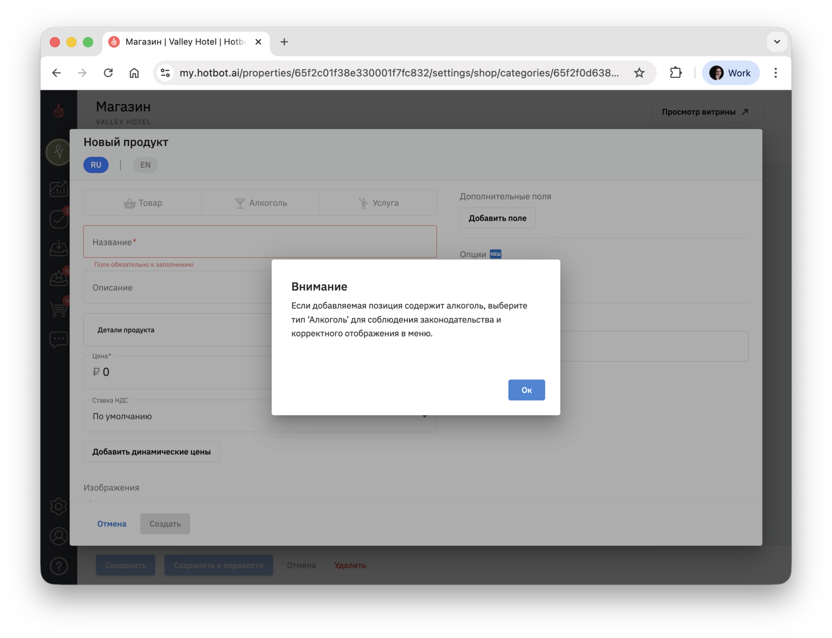 Создавать новые продукты можно как во вкладке Продукты, так и на странице подкатегории в окне добавления продуктов.